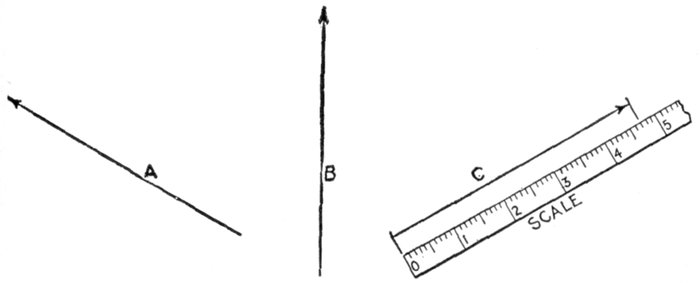 Fig. 2,123.—Vectors. A vector is defined as: a line, conceived to have both a fixed length and a fixed direction in space, but no fixed position. Thus A and B are lines, each having a fixed length, but no fixed direction. By adding an arrow head the direction is fixed and the line becomes a vector, as for example vector C. The fixed length is usually taken to represent a definite force, thus the fixed length of vector C is 4.7 which may be used to represent 4.7 lbs., 4.7 tons, etc., as may be arbitrarily assumed.
