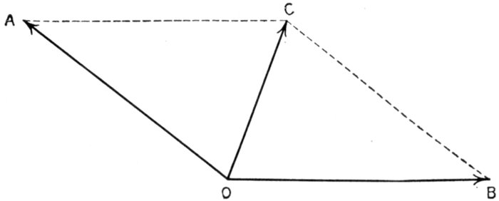 Fig. 2,124.—Parallelogram of forces. OC is the resultant of the two forces OA and OB. The length and direction of the lines represent the intensity and direction of the respective forces, the construction being explained in the accompanying text.