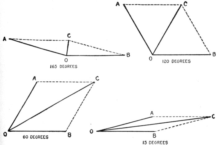 Figs. 2,125 to 2,128.—Parallelograms of forces showing increase in magnitude of the resultant of two forces, as their difference of direction, or electrically speaking, their phase difference is diminished. The diagrams show the growth of the resultant of the two equal forces OA and OB as the phase difference is reduced from 165° successively to 120, 60, and 15 degrees.