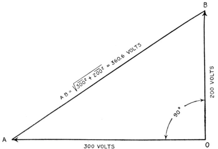 This is easily done graphically as in fig. 2,129 by taking a scale, say, 1" = 100 volts and laying off OA = 3" = 300 volts, and at right angles OB = 2" = 200 volts, then by measurement AB = 3.606" = 360.6 volts.