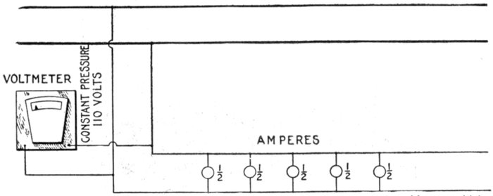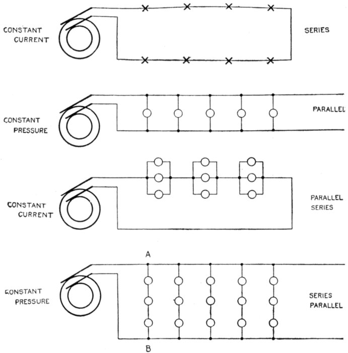 1. If two alternating pressures which agree in phase are connected together in series, the voltage at the free terminals of the circuit will be equal to their arithmetical sum, as in the case of direct currents.