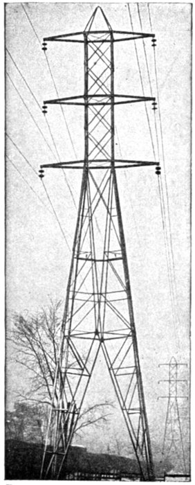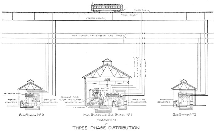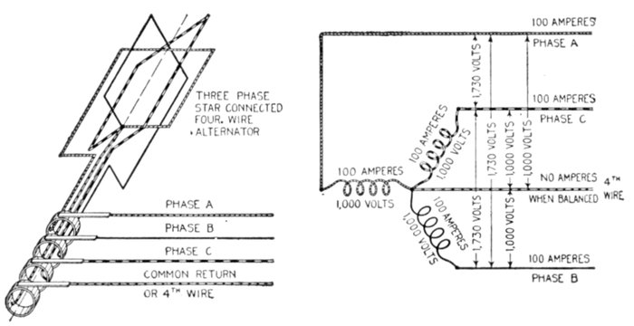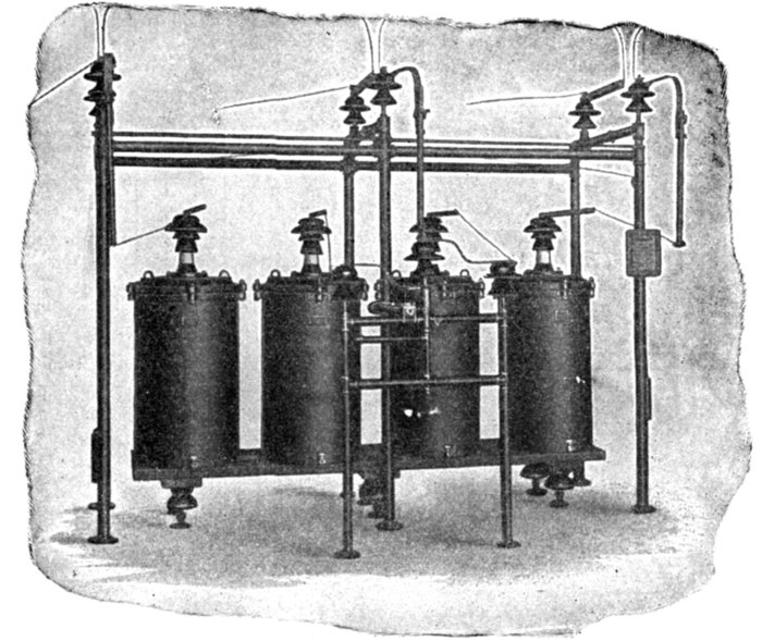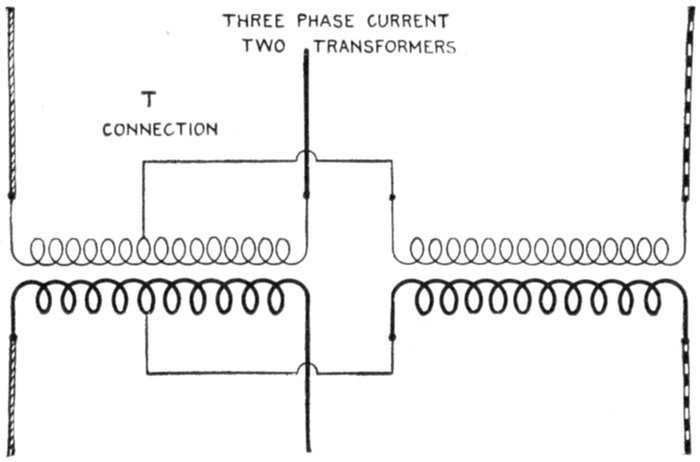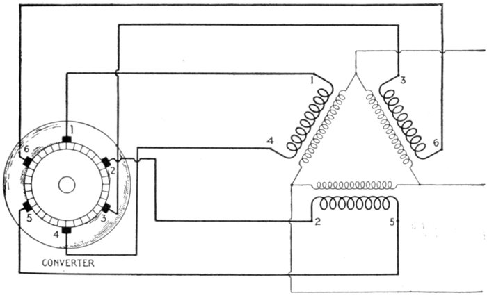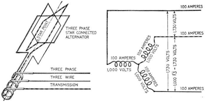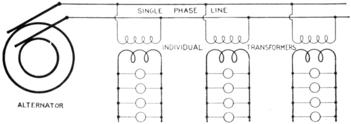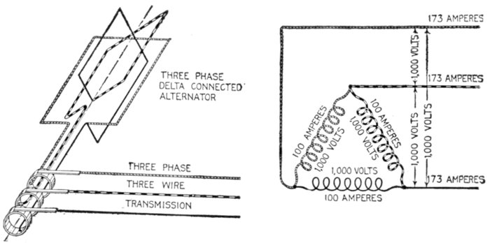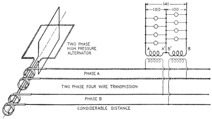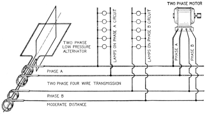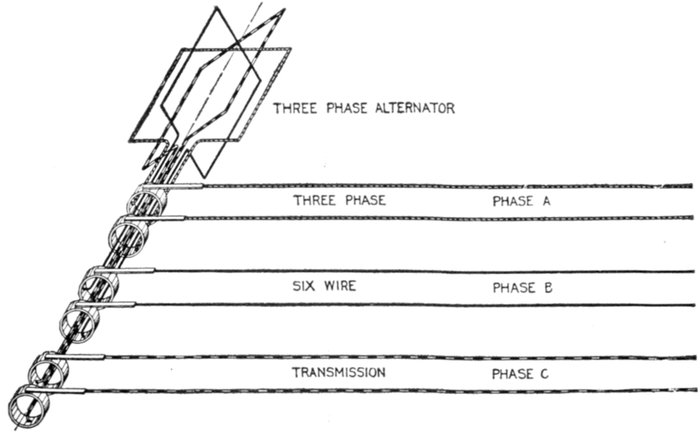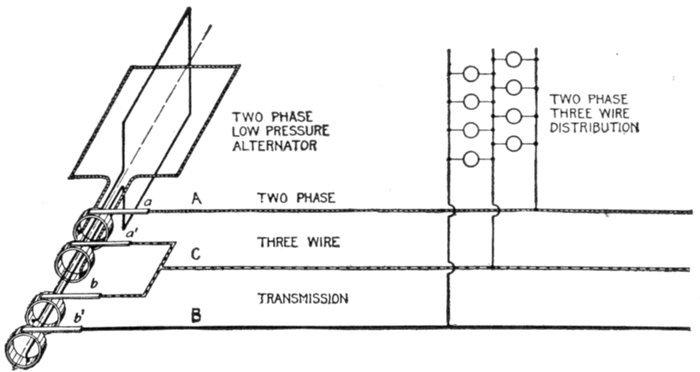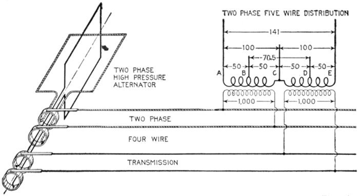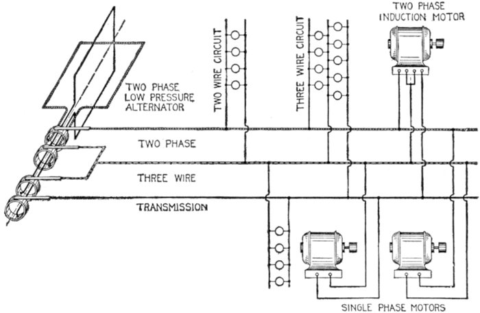 Furthermore, when the fact that two phase current can be readily transformed into three phase current, and these converted into direct current, and vice versa, by means of rotary converters and rectifiers, is added to the advantages derived by the use of high tension systems, it is apparent that the opportunity for elaboration becomes almost unlimited. These conditions have naturally tended toward the development of a great variety of systems, employing more or less complicated circuits and apparatus, and although alternating current practice is still much less definite than direct current work, certain polyphase systems are now being generally accepted as representing the highest standards of power generation, transmission and distribution.