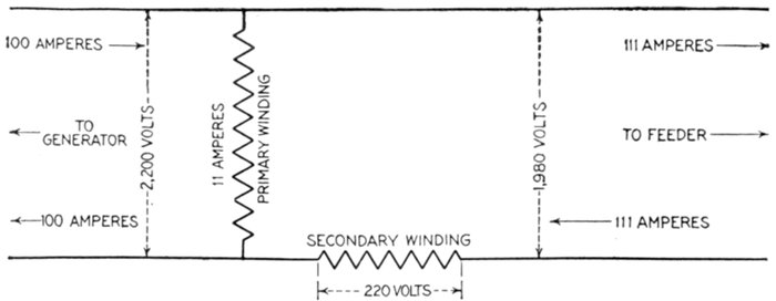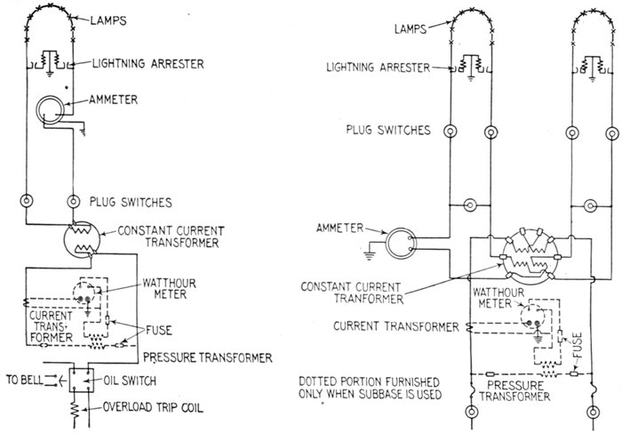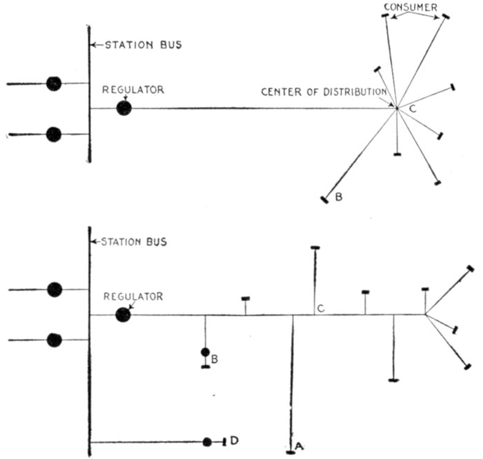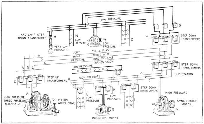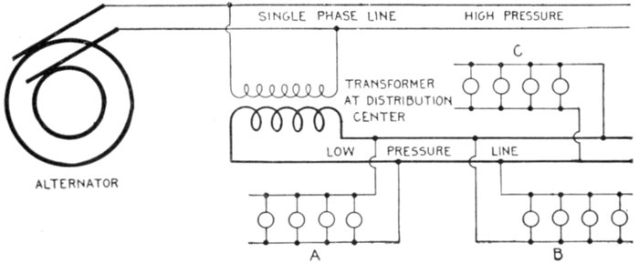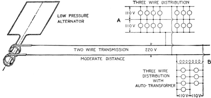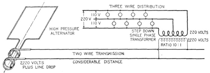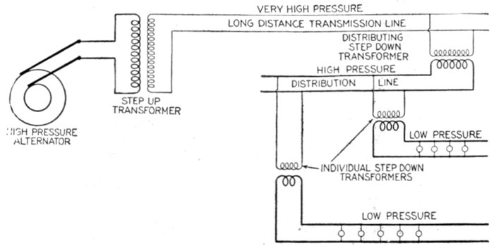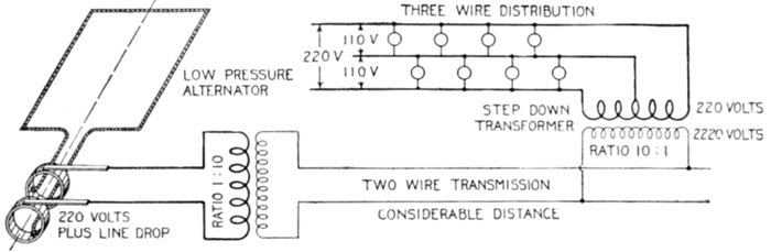 The facility with which alternating current can be transformed from one voltage to another, thus permitting high pressure transmission of electric energy to long distances through small wires, and low pressure distribution for the operation of lighting systems and motors, gives a far greater variety of systems of transmission and distribution than is possible with direct current.