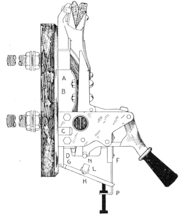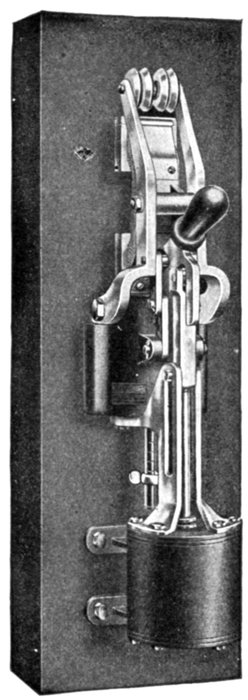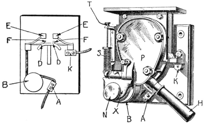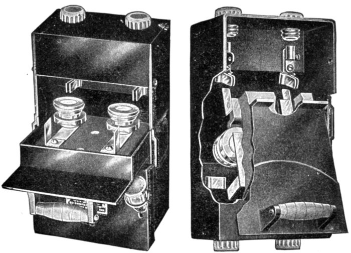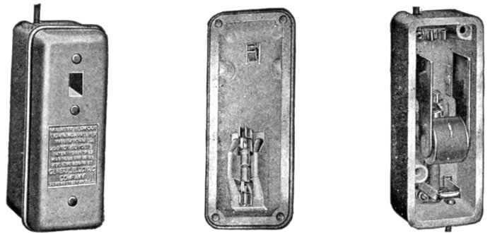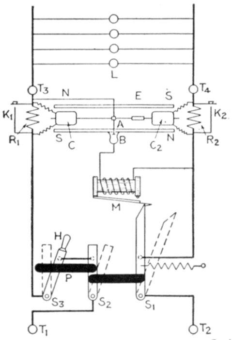 Fig. 2,582.—Wallis-Jones automatic earth leakage cut out. It is an instrument which so protects a direct current circuit that the circuit is broken whenever a leak occurs from either main to earth, and so that the circuit cannot be permanently re-established until the leak has been removed. The instrument and its connections may be explained by the aid of the accompanying diagram, in which T1 and T2 represent the points of connection from the mains, and T3 and T4, the points of connection to the circuit to be protected. So S2, and S3 will preferably be ordinary tumbler switches, but they are diagrammatically represented as plain bar switches, their fixed contacts being diagrammatically represented by dotted circles. When the three switches S1, S2, and S3 are closed, the current passes from T1 to T3 through the small resistance R1, through circuit L to T4, and back through the resistance R2 to T2. In shunt with R1 and R2, are the two moving coils C and C2, working in the magnetic field of the magnets NS, NS, and rigidly fixed on one spindle, which is broken electrically by an ebonite block E. The points of connection to the shunts are adjusted so that when the same current passes out through one and back through the other, the effect on the two coils is equal and opposite, and there is thus no movement. Should, however, any minute portion of the current through R1 leak to earth instead of returning via R2, the balance is disturbed, C becomes stronger than C2, the system is deflected, and a contact is made by the arm A at B, no matter in which direction the coils deflect. The system is similarly deflected for a leak on the other lead. In the diagram these contacts are shown at right angles to their normal plane. As soon as the contact is made, the electromagnet M is energized, the arm of S1 is released and the spring at once pulls it off its contact, at the same time breaking S2. The positions of the blades when the switches are open are shown dotted. The only means the user has of closing the circuit is by putting on S3 by the handle H, which is outside the locked box. The first effect of putting on S3 is to break its circuit; it then by means of the slotted bar P begins to pull on S2 and S1, which can thus be closed again, and held closed by the trigger as before. The circuit, is, however, still broken till S2 is pushed back. Then if the leak be still on, the slot in P allows S1 and S2 to open at once as before. It is therefore impossible to keep the circuit closed while the leak exists. The working condition of the instrument can be tested at any time by switching a lamp on in the circuit and depressing one of the keys K1, K2. This short circuits R1 or R2, throws the coils out of balance, and the switch opens. The contact arm is closed in an inner dust tight case, and it will be noted that it makes contact only; the break occurs at the switches, thus avoiding any sparking. Since the two coils work in the two gaps of one and the same field, changes in the strength of the magnets have no effect, the apparatus is enclosed in a locked metallic box, and the only part to which the user has access is the handle H, and, if desired, the testing keys K1 K2.]