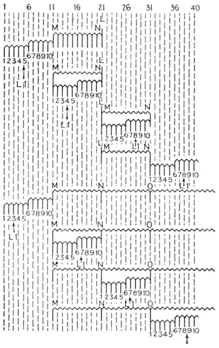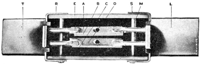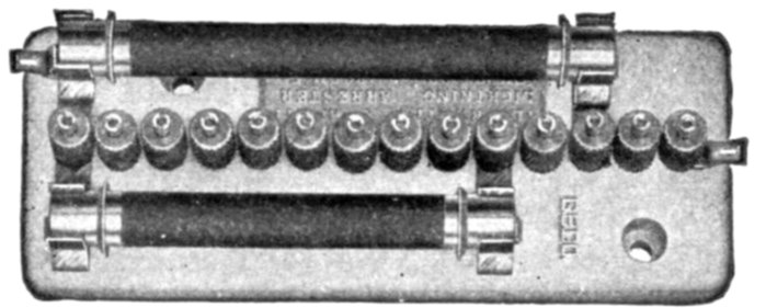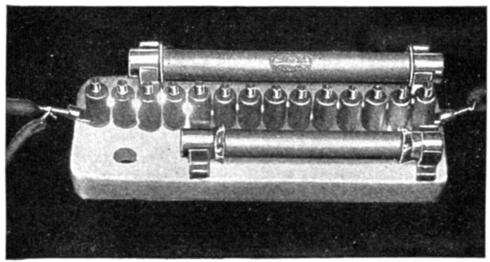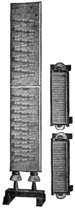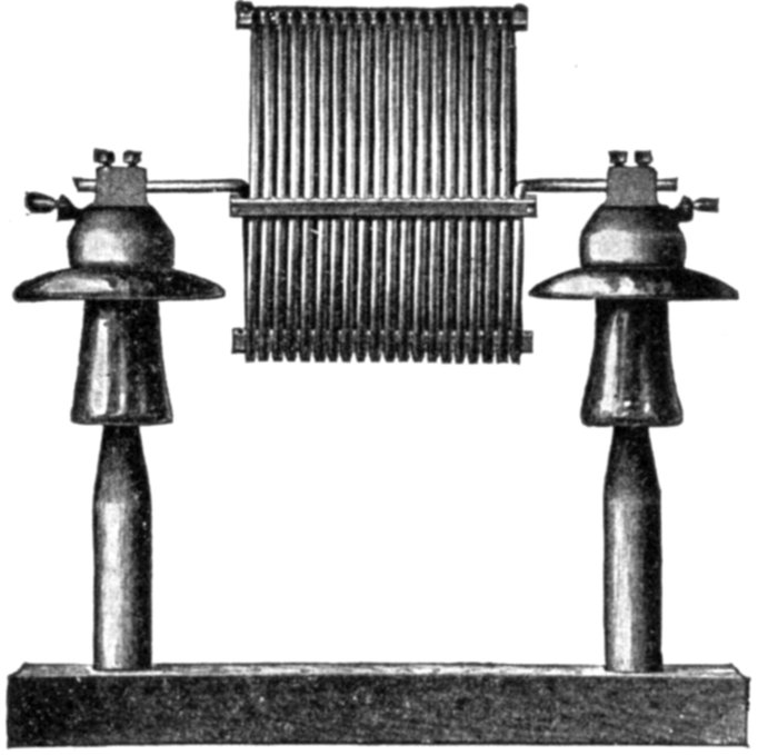 The construction and operation of the instrument may be better understood from figs. 2,565 and 2,566, which illustrates the indicating part of the Frahm meter. This consists of one or more rows of tuned reeds rigidly mounted side by side on a common and slightly flexible base.