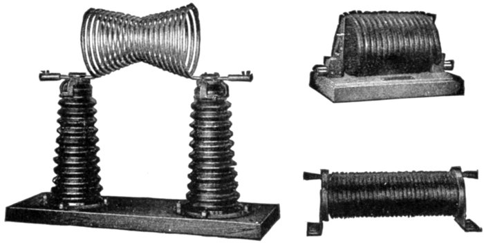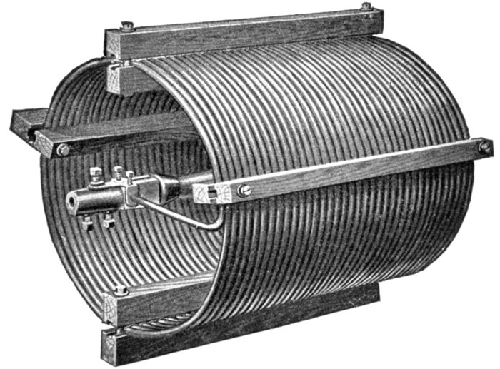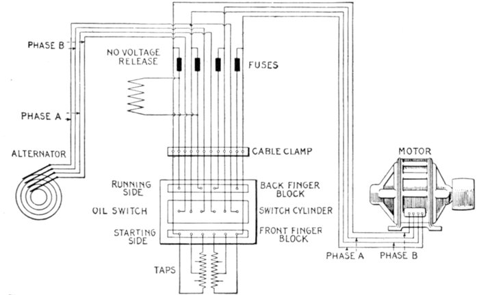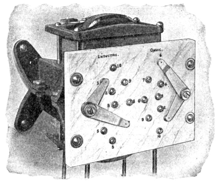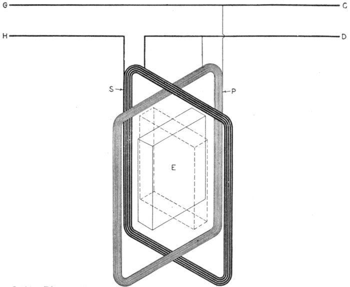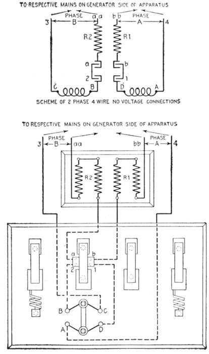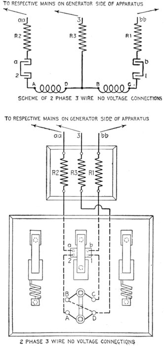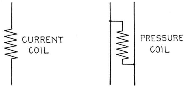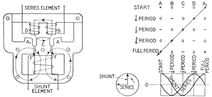 Ans. It consists of two pressure coils, as shown in fig. 2,579, placed at right angles to each other, one being connected through a resistance, and the other through an inductance so as to "split" the phase and get the equivalent of a rotating magnetic field.