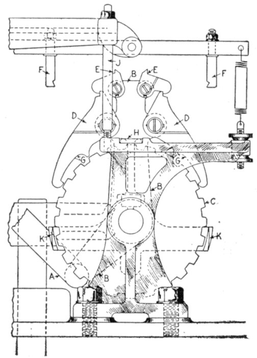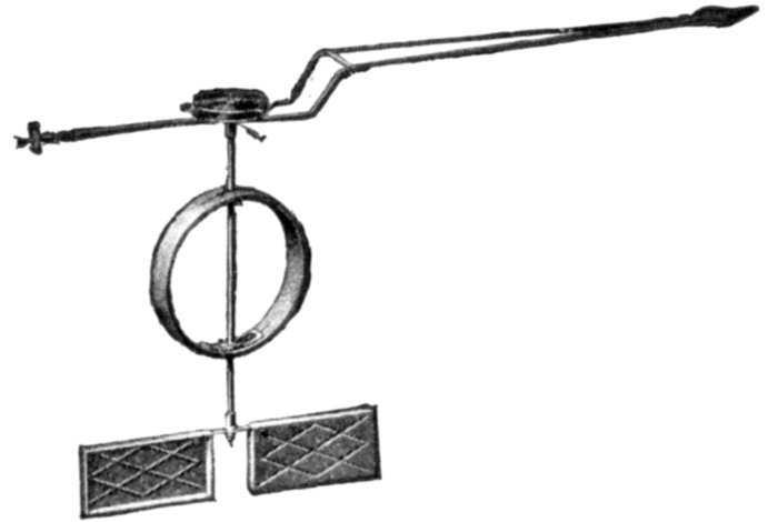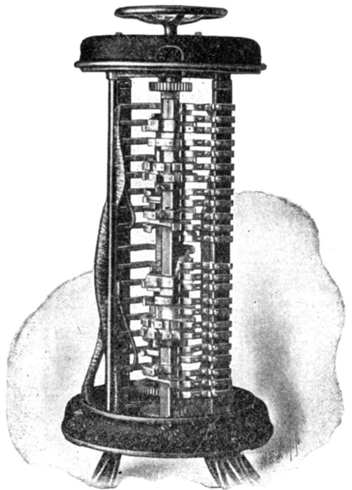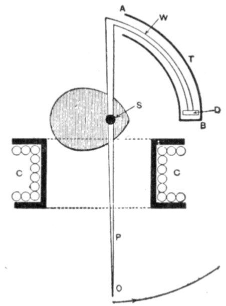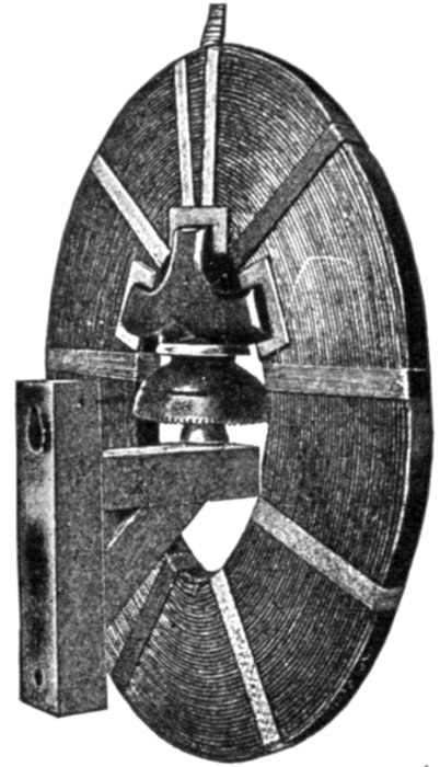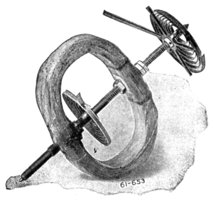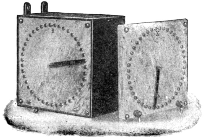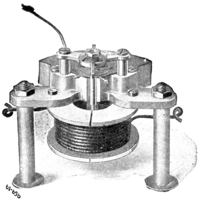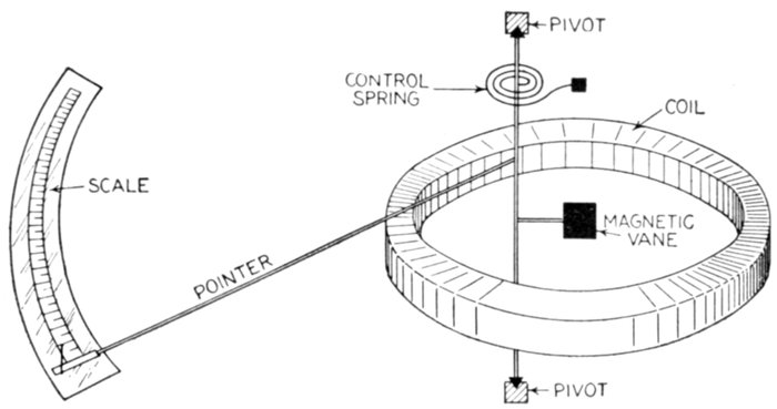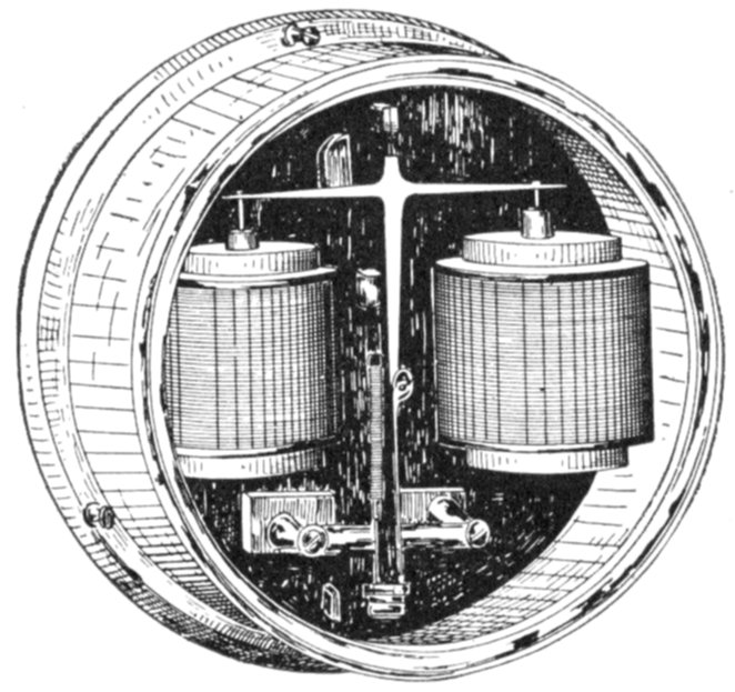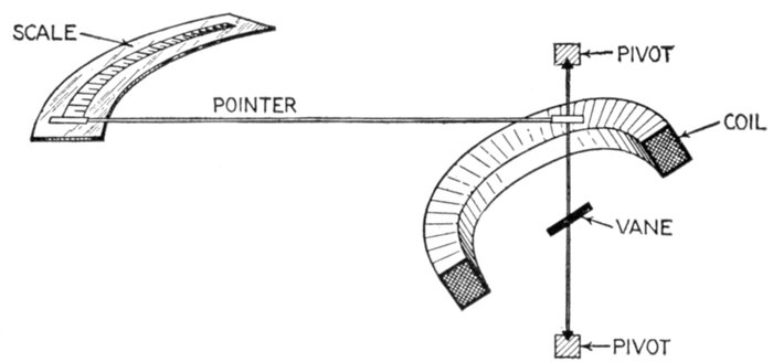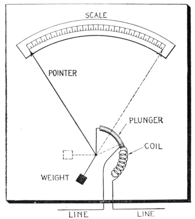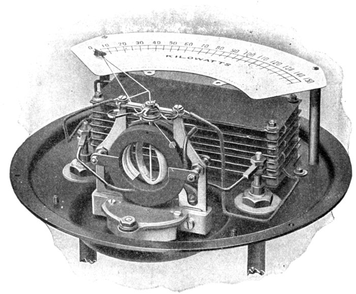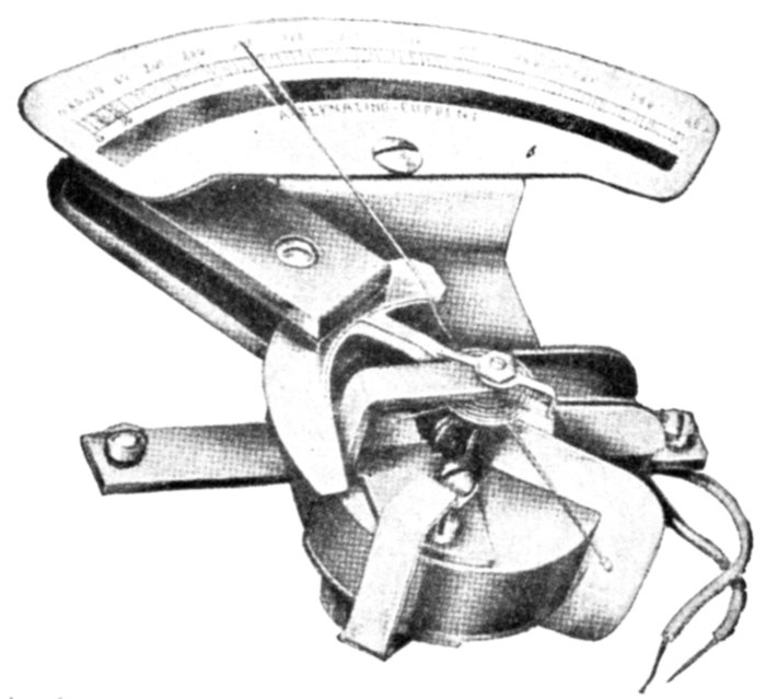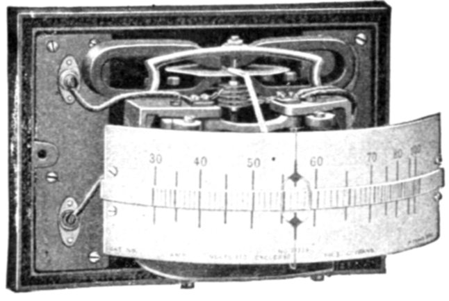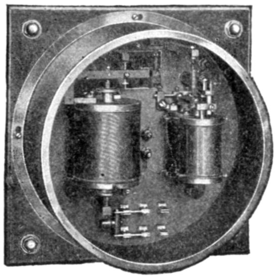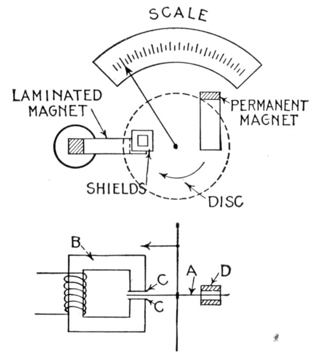 Ans. It consists of two voltmeter electromagnets acting in opposition on a disc attached to the pointer shaft. One of the magnets is in series with an inductance, and the other with a resistance, so that any change in the frequency will unbalance the forces acting on the shaft and cause the pointer to assume a new position, when the forces are again balanced. The aluminum disc is so arranged that when the shaft turns in one direction[Pg 1830] the torque of the magnet tending to rotate it decreases, while the torque of the other magnet increases. The pointer therefore comes to rest where the torques of the two magnets are equal, the pointer indicating the frequency on the scale.