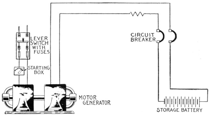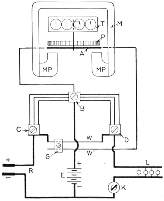 Fig. 2,562.—Circuit diagram of Sangamo differential shunt type ampere hour meter for use in battery charging. Since a battery absorbs more energy on charge than it will give out on discharge, at its working voltage, it is usually given a certain amount of overcharge. This makes desirable a meter that automatically allows for the proper amount of overcharge. Such a meter indicates at all times the amount of electricity available for useful work without resetting the pointer every time the battery is charged. In other words, the battery and the meter would keep in step for considerable periods of time without readjustment. The Sangamo differential shunt meter is designed to meet these requirements, and it consists essentially of a Sangamo meter with two shunts connected as shown. The relative value of shunt resistance is adjustable by means of slider G, so that the meter can be made to run slow on charge or fast on discharge, whichever may be desired. The usual method is to allow the meter to register less than the true amount on charge and the exact amount on discharge, the difference representing the loss in the battery, or the overcharge. If the meter be provided with a charge stopping device, the battery can be given an amount of overcharge predetermined by the setting of the slider G. Therefore the amount of overcharge can be fixed in advance by a skilled man and the actual charging done by any unskilled person, since all there is to do is to make the connection.