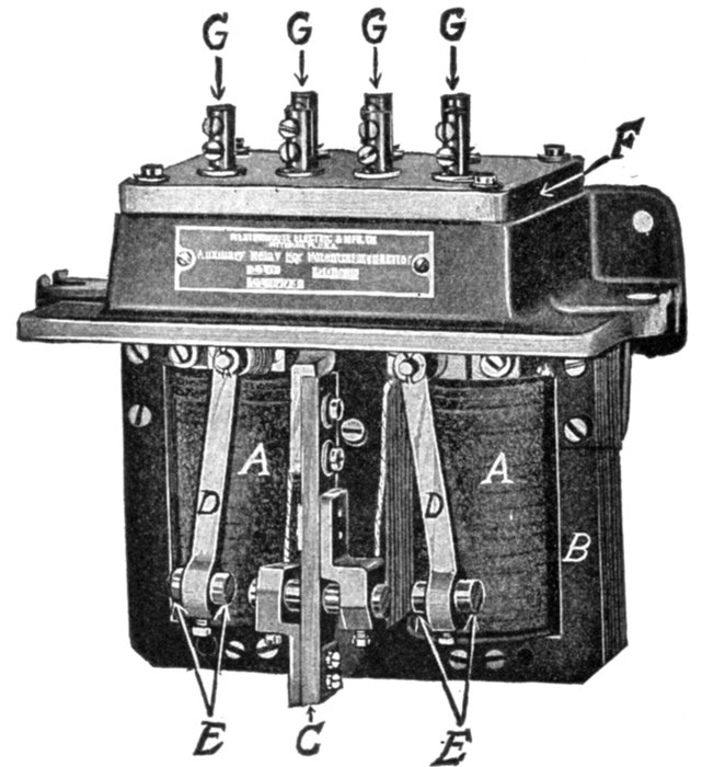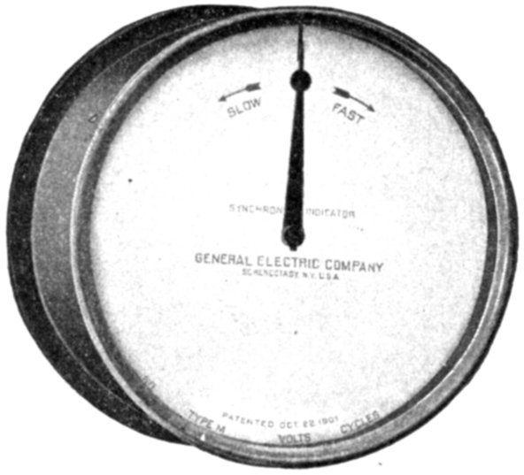 Fig. 2,571.—General Electric synchronism indicator. The synchronism indicator is a motor whose field is supplied with single phase current from one of the machines to be synchronized, and its armature from the other. The armature carries two inductance coils placed at a large angle, one supplied through a resistance, the other through an inductance. This arrangement generates a rotating field in the armature, while the stationary field is alternating. The armature tends to assume a position where the two fields coincide when the alternating field passes through its maximum; hence, the armature and pointer move forward or backward at a rate corresponding to the difference of frequency, and the position when stationary depends on the phase relation. When the machines are running at the same frequency and in phase the pointer is stationary at the marked point. In construction, it is like a small, two phase, bipolar synchronous motor, the field being supplied with alternating instead of direct current. The armature is mounted in ball bearings in order to make it sufficiently sensitive and smooth in operating. The armature coils are not exactly 90 degrees apart, since it is not possible to get the current in the two coils exactly in quadrature without introducing condensers on other complicated construction. Standard ratings are for 110 and 220 volt circuits. Synchronism indicators should be ordered for the frequency of the circuit on which they are to be operated, although the instruments may be used on circuits varying 10 per cent to 15 per cent from the normal. The words "Fast" and "Slow" on the dial indicate that the frequency on binding posts E and F is respectively higher or lower than that on A and B; or, in other words, clockwise rotation of the pointer means that the incoming machine is running at too high speed, counter clockwise rotation indicating too low speed.