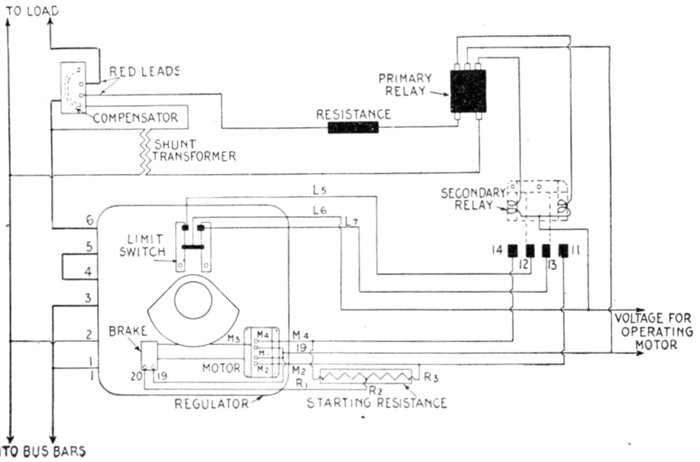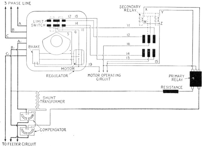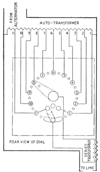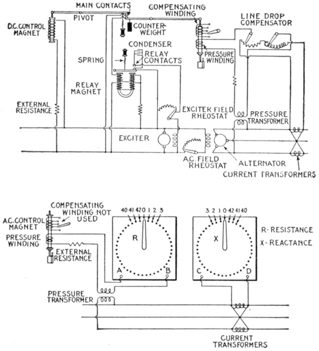 | Regulation of alternators—a.c. feeder regulation—application of induction type regulators; types: induction, and variable ratio transformer regulators; operation of induction regulators; neutral position; regulator capacity—polyphase induction regulators: construction, operation; automatic control; why two relays are used; difficulties encountered in operation of relays; vibration or chattering of the contacts; poor contact of primary relay—variable ratio transformer voltage regulators: types: drum, and dial; dial type for high voltage—small feeder voltage regulators: construction and operation; adjustment—automatic voltage regulators for alternators: method of regulation—line drop compensators: essential parts; connections; construction and operation; diagram of automatic voltage regulator using a line drop compensator—starting compensators: necessity for; construction and operation—star delta switches. | |