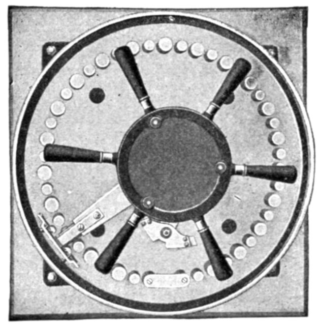 Fig. 2,570.—Westinghouse rotary type of synchroscope or synchronism indicator. The indication is by means of a pointer which assumes at every instant a position corresponding to the phase angle between the pressures of the busbars and the incoming machine, and therefore rotates when the incoming machine is not in synchronism. The direction of rotation indicates whether the machine be fast or slow, and the speed of rotation depends on the difference in frequency. The pointer is continuously visible, during both the dark and light periods of the synchronizing lamps.