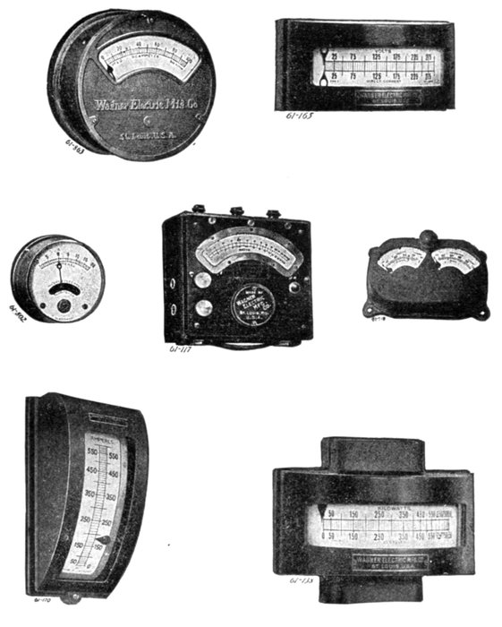 | Virtual value of an alternating current or pressure—the word effective erroneously used for virtual: steam engine analogy illustrating this error—classification of instruments: electromagnetic or moving wire, hot wire, induction, dynamometer—electromagnetic or moving iron instruments: types: plunger, inclined coil, magnetic vane; [Pg vi]character of scale; objections and precautions—inclined coil instruments—magnetic vane instruments—hot wire instruments—induction instruments: types: shielded pole, rotary field; operation of both types—dynamometers: construction and operation; how arranged to measure watts—watthour meters: types: commutator, induction, Faraday disc; essential parts; object of the motor; object of generator; objection to commutator meter—principles of induction watthour meters: essential parts; strength of rotating field; moving element; retarding element; registering element; frame and bearings; friction compensator; power factor adjustment; frequency adjustment—Faraday disc, or mercury motor ampere hour meter: construction and operation—frequency indicators: types: synchronous motor, resonance, induction; synchronous motor as frequency indicator—resonance frequency indicators: adaptation—induction frequency meter: construction and operation—synchronism indicators: types: lamp or voltmeter, resonance or vibrating reed, rotating field—power factor indicators: wattmeter type; disc, or rotating field type—ground detectors. | |