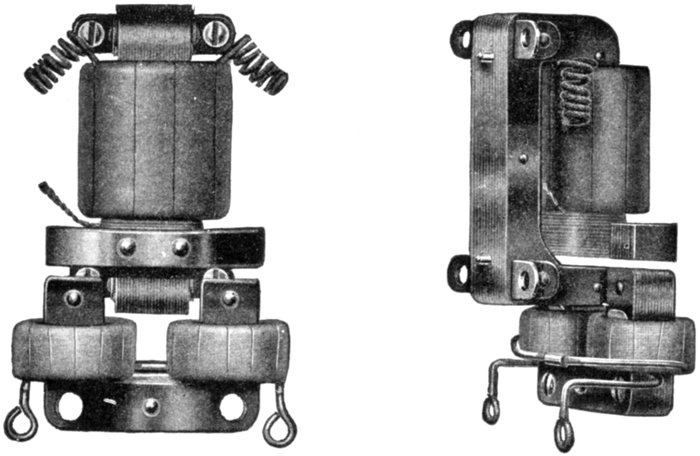 A piece of soft iron, rigidly fastened on the base plate which supports the reeds, forms the armature of a magnet.