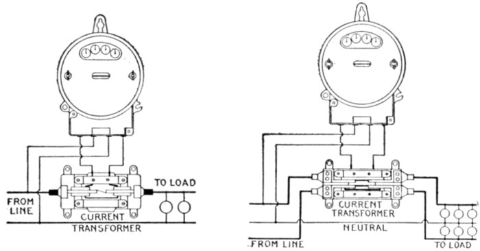 Figs. 2,556 and 2,557. Connections of Sangamo single phase induction meter. Fig. 2,556, 2 wire meter exceeding 100 amperes; fig. 2,557, 3 wire meter exceeding 100 amperes.