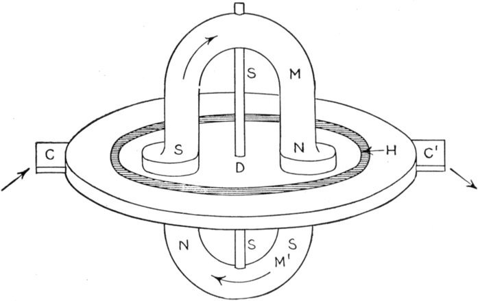 Ans. The electric current, as shown in fig. 2,558, enters the contact C, passes through the comparatively high resistance mercury H to the edge of the low resistance copper disc D across the disc to the mercury H and out of contact C'. The magnetic flux cuts across the disc on each side from N to S, making a complete circuit through M and M'. The relative directions of the magnetic flux and the current of electricity as well as the resulting motion are shown in fig. 2,559. According to the laws of electromagnetic induction, if a current carrying conductor cut a magnetic field of flux at right angles, a force is exerted upon the conductor, tending to push it at right angles to both the current and the flux. When connected to an eddy current damper or generator which requires a driving force directly proportional to the speed of rotation, the mercury[Pg 1824] motor generator becomes a meter. The speed of such a meter is a measure of the current or rate of flow of the electricity through the motor element, and each revolution of the motor corresponds to a given quantity of electricity. Then, by connecting a revolution counter to this motor generator, a means is provided for indicating the total quantity of electricity in ampere hours that is passed through the meter.
