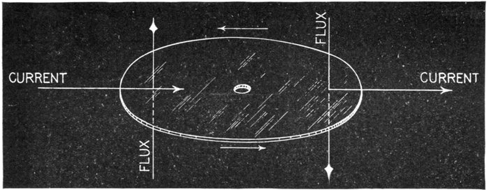 Fig. 2,559.—Diagram showing relative direction of current, magnetic flux, and motion of disc in Faraday disc, or mercury motor ampere hour meter.