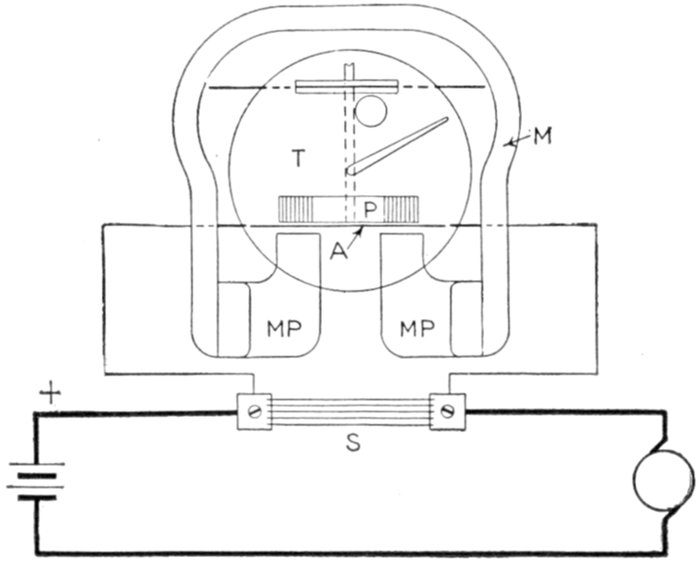 Fig. 2,561.—Circuit diagram of simple shunt Sangamo ampere hour meter. It is rated at 10 amperes, larger currents being measured by using shunts. In operation, the main or line current to be measured passes through the shunt, while a part proportional to the drop across the shunt, is shunted through the meter and measured. The only effect of reversing the current will be to reverse the direction of rotation of the meter. In battery installations it is never possible to take the same number of ampere hours from a battery as are put into it, hence, if the simple shunt ampere hour meter be used for repeated and successive charges and discharges, it will be necessary to reset the pointer to zero each time the battery is fully charged. When the shunt meter is equipped with a charge stopping device, the pointer is reset while charging, to allow for a predetermined overcharge.