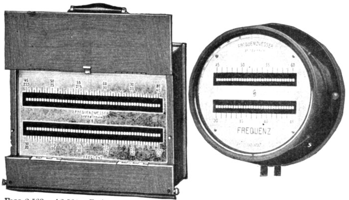 Figs. 2,563 and 2,564.—Frahm resonance type frequency meter. Fig, 2,563, portable meter; fig. 2,564, switchboard meter. The readings are correct in either the vertical or horizontal position. The energy consumption at 100 volts is about 1 to 2 volt amperes, and is approximately proportional for other pressures. The regular portable meters are arranged for pressures of from 50 to 300 volts, and for this purpose they are fitted with terminals for 65, 100, 130, 180, and 250 volts. In order to obtain full amplitude at intermediate pressures, a milled headed screw is provided for adjusting the base piece mechanically, and thereby permitting of regulating the pressure range within ±20 per cent; this insures indications of maximum clearness. Should it be desired to extend the standard pressure range of 50 to 300 volts, up to 600 volts, two further terminals for 350 and 500 volts are necessary, so that these instruments are provided with eight fixed terminals in addition to the mechanical regulating device. Instruments which are intended for connecting to one specific supply or to the secondary of a pressure transformer, require only a single pressure range, say 100 volts, with the aforementioned regulating device. The frequency range is from 7.5 to 600 cycles per second. In order to obtain easily readable indications, one reed is provided for every quarter period for frequencies below 30, for every half period for frequencies between 30 and 80, and for every whole period for frequencies between 80 and 140. The use of a smaller number of reed, that is to say, of larger intervals between the periods of vibration of adjoining reeds, is only recommended for circuits having very variable frequencies, as otherwise no reed might respond to the vibrations caused by intermediate frequencies. The arrangement of the separate reeds on a common base piece, permits supplying any combination of interval that may be required. It is often desirable to secure two ranges with one set of reed. To do this a second electromagnet is supplied. It is polarized, and operates on the same base plate. In the case of alternating current when the unpolarized magnet is used the reeds receive two impulses during each cycle, while with the polarized magnet they receive but one impulse per cycle. A commutator is provided to easily make the change from one range to the other. If there be two sets of reed, the one commutator may be connected to change both. This device is only applicable when alternating current is measured. Instruments with unpolarized magnets are made with frequencies of 15 to 300 cycles per second.