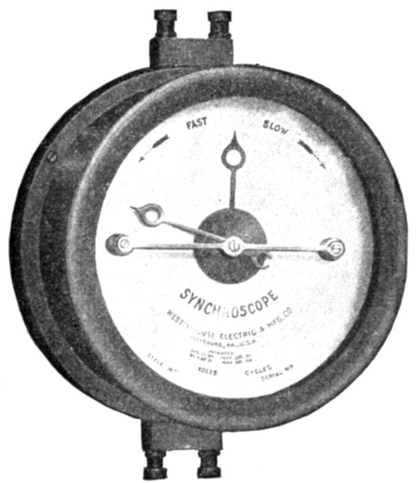 Synchronism Indicators.—These devices, sometimes called synchroscopes, or synchronizers indicate the exact difference in phase angle at every instant, and the difference in frequency, between an incoming machine and the system to which it is to be connected, so that the coupling switch can be closed at the proper instant. There are several types of synchronizer, such as