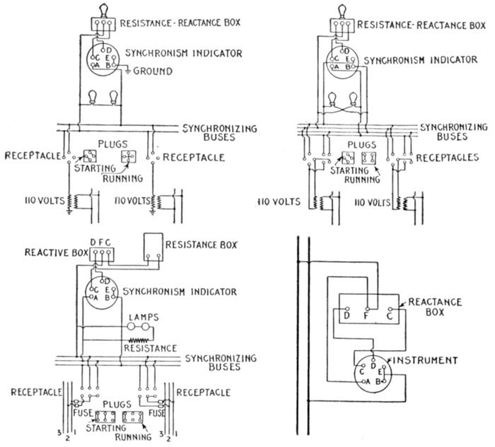 Figs. 2,573 to 2,576.—Connections of General Electric synchronism indicator. Fig. 2,573, connections with grounded secondaries on pressure transformers; fig. 2,574, connections with ungrounded secondaries on pressure transformers; fig. 2,575, connections for 200 to 240 volt circuits, with six point receptacles; fig. 2,576, connections for checking location of needle. The various letters referred to in the diagrams will be found marked on the ends of the instrument studs and back of reactance coil box. It is important that the instrument be connected in circuit in the proper manner so that the needle will come to the mark on the upper part of the scale when synchronism is obtained. In case the pointer become moved or a change in its position be necessary, it is advisable to make a check on the indication before relocating the needle. This test can be made as follows: Connect together (fig. 2,573) studs marked B and E and connect stud A to terminal F on the external reactance box. When these connections are made, the instrument can be connected to a single phase circuit of normal voltage and if the instrument be correct, the pointer will stand vertically at the point of synchronism. If it do not, the needle can be moved and should be fastened in the correct position. The synchronizing lamps when connected as illustrated in the diagrams, show dark when synchronism is reached. This is the only connection possible when grounded secondaries are used, as in fig. 2,573, and for the high voltage indicators when used as in fig. 2,575, but with ungrounded secondaries (fig. 2,574) the lamps may be connected as indicated, when they will show bright at the moment of synchronism. The connections to the synchronism indicator remain the same as before.