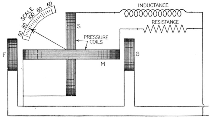 The coils are placed about a common axis, along which is pivoted an iron disc or vane. The magnetizing coils FG are in series with the load. If the load be very inductive, the coil M experiences very little torque and the system will set itself as shown in the figure. As the load becomes less inductive, the torque on S decreases and on M increases so that the system takes up a particular position for every angle of lag or lead.