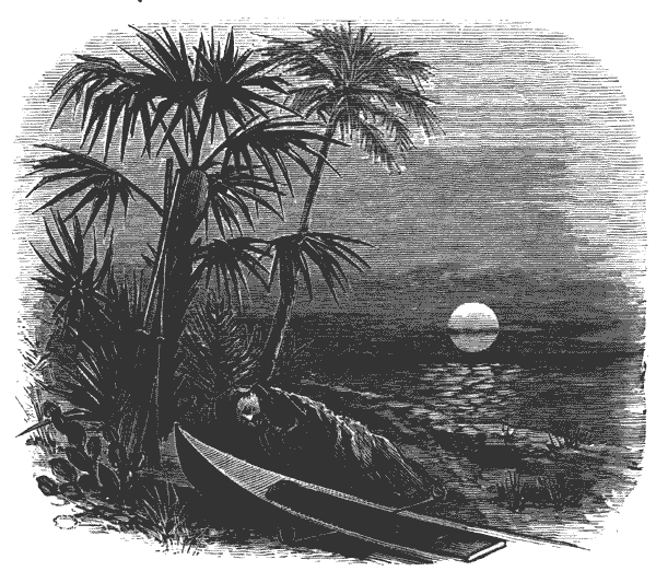 Our tired party landed on a shelly beach, and burned a grassy area to destroy sand-fleas. This done, some built a large camp-fire, while others spread blankets upon the ground. I drew the faithful sharer of my long voyage near a thicket of prickly-pears, and slept beside it for the last time, never thinking or dreaming that one year later I should approach the mouth of the Suwanee from the west, after a long voyage of twenty-five hundred miles from the head of the Ohio River, and would again seek shelter on its banks. It was a night of sweet repose. The camp-fire dissipated the damps, and the long row made rest welcome.