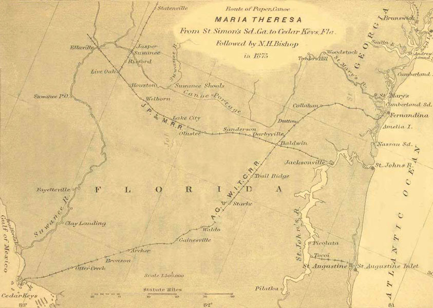 It was nearly ten o'clock a. m. on Friday, March 26th, when our merry party left Old Town Hammock. This day was to see the end of the voyage of the paper canoe, for my tiny craft was to arrive at the waters of the great southern sea before midnight. The wife and[347] daughters of our host, like true women of the forest, offered no forebodings at the departure of the head of their household, but wished him, with cheerful looks, a pleasant voyage to the Gulf. The gulf port of Cedar Keys is but a few miles from the mouth of the Suwanee River. The railroad which terminates at Cedar Keys would, with its connection with other routes, carry the members of our party to their several homes.