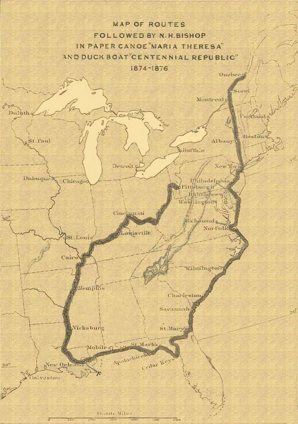 After returning from this paper-canoe voyage, the author embarked alone, December 2, 1875, in a cedar duck-boat twelve feet in length, from the head of the Ohio River, at Pittsburgh, Pennsylvania, and followed the Ohio and Mississippi rivers over two thousand miles to New Orleans, where he made a portage through that city eastwardly to Lake Pontchartrain, and rowed along the shores of the Gulf of Mexico six or seven hundred miles, to Cedar Keys, Florida, the terminus of his paper-canoe voyage.