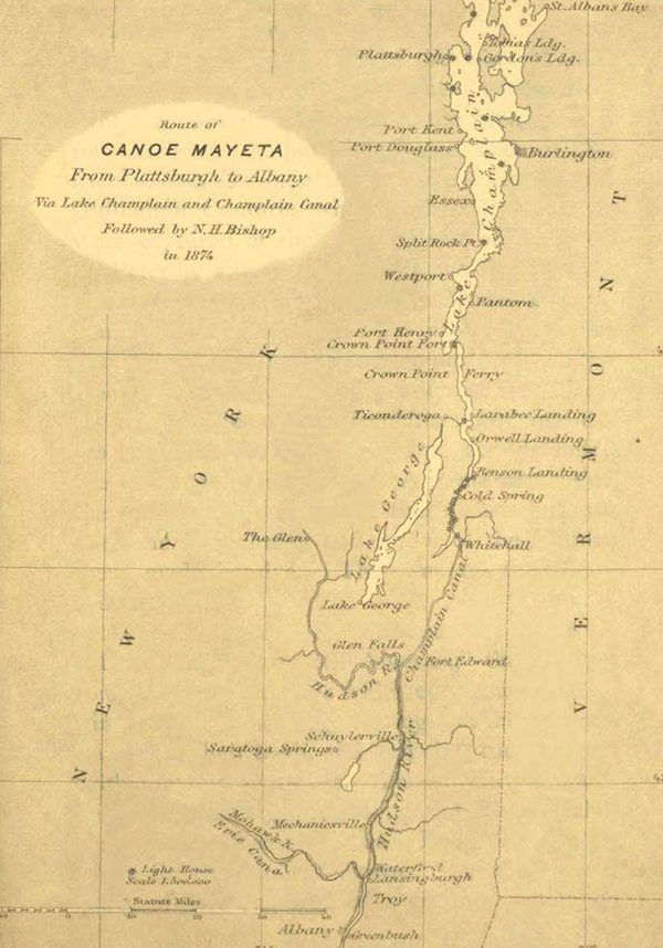 The author left Quebec, Dominion of Canada, July 4, 1874, with a single assistant, in a wooden canoe eighteen feet in length, bound for the Gulf of Mexico. It was his intention to follow the natural and artificial connecting watercourses of the continent in the most direct line southward to the gulf coast of Florida, making portages as seldom as possible, to show how few were the interruptions to a continuous water-way for vessels of light draught, from the chilly, foggy, and rocky regions of the Gulf of St. Lawrence in the north, to the semi-tropical waters of the great Southern Sea, the waves of which beat upon the sandy shores of the southernmost United States. Having proceeded about four hundred miles upon his voyage, the author reached Troy, on the Hudson River, New York state, where for several years E. Waters & Sons had been perfecting the construction of paper boats.