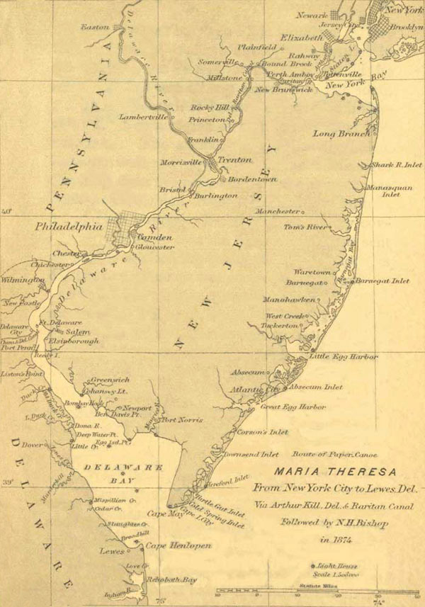 Paper Canoe Maria Theresa.—The Start.—The Descent of the Hudson River.—Crossing the Upper Bay of New York.—Passage of the Kills.—Raritan River.—The Canal Route from New Brunswick to the Delaware River.—From Bordentown to Philadelphia. 71