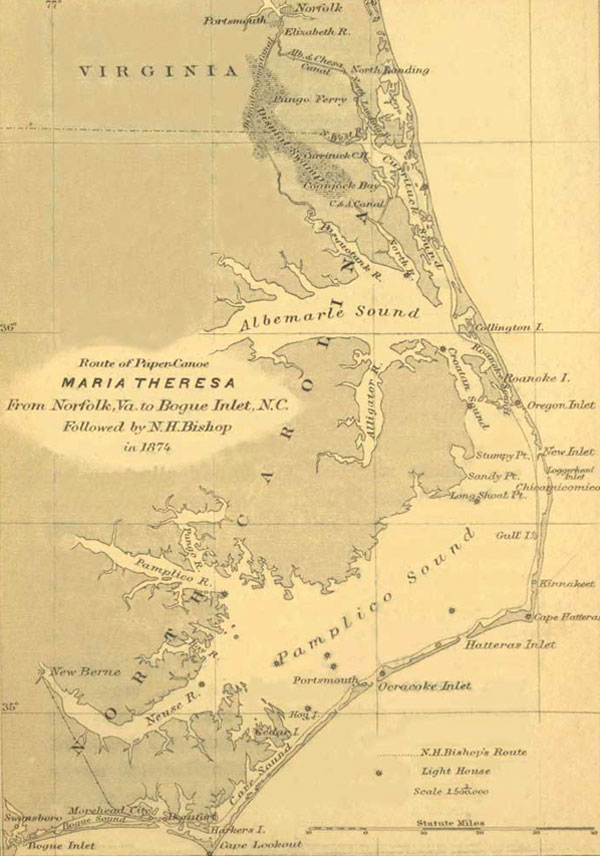 The Elizabeth River.—The Canal.—North Landing River.—Currituck Sound.—Roanoke Island.—Visit to Body Island Light-House.—A Romance of History.—Pamplico Sound.—The Paper Canoe arrives at Cape Hatteras.148