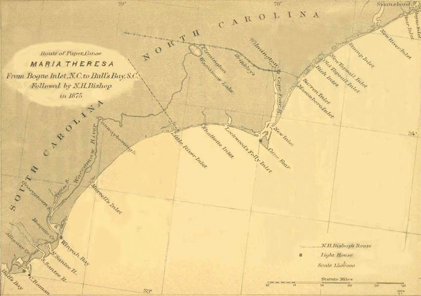 The advantages in using a boat of only fifty-eight pounds weight, the strength and durability of which had been well and satisfactorily tested, could not[vi] be questioned, and the author dismissed his assistant, and "paddled his own canoe" about two thousand miles to the end of the journey. Though frequently lost in the labyrinth of creeks and marshes which skirt the southern coast of his country, the author's difficulties were greatly lessened by the use of the valuable and elaborate charts of the United States Coast Survey Bureau, to the faithful executers of which he desires to give unqualified and grateful praise.