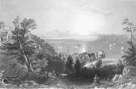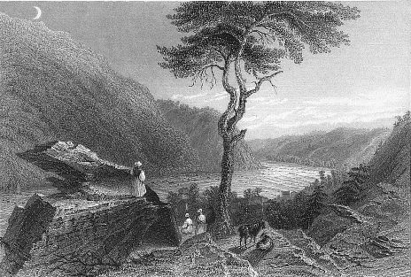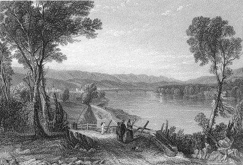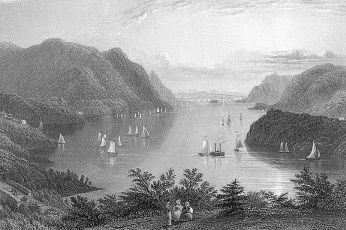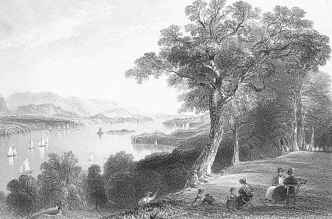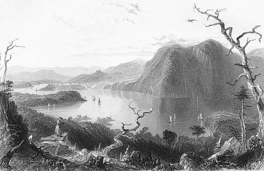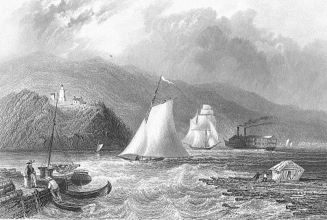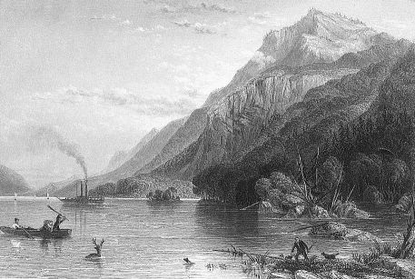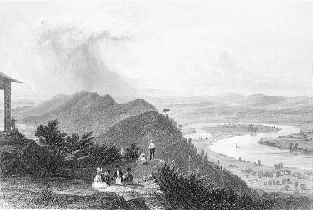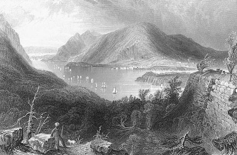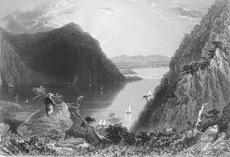 This view out from the gorge of the highlands presents a foreground of cliff and shadow, with their reflections almost folded across in the bosom of the river, and a middle ground of the village of Newburgh and the gently-undulating country in the rear. The blue and far-off line of the Kaatskills shuts in the horizon.