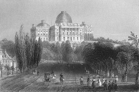 must feed his imagination on the future. The American does so. His mind, as he tracks the broad rivers of his own country, is perpetually reaching forward. Instead of looking through a valley, which has presented the same aspect for hundreds of years—in which live lords and tenants, whose hearths have been surrounded by the same names through ages of tranquil descent, and whose fields have never changed landmark or mode of culture since the memory of man, he sees a valley laden down like a harvest waggon with a virgin vegetation, untrodden and luxuriant; and his first thought is of the villages that will soon sparkle on the hill-sides, the axes that will ring from the woodlands, and the mills, bridges, canals, and rail-roads, that will span and border the stream that now runs through sedge and wild-flowers. The towns he passes through on his route are not recognizable by prints done by artists long ago dead, with houses of low-browed architecture, and immemorial trees; but a town which has perhaps doubled its inhabitants and dwellings since he last saw it, and will again double them before he returns. Instead of inquiring into its antiquity, he sits over the fire with his paper and pencil, and calculates what the population will be in ten years, how far they will spread, what the value of the neighbouring land will become, and whether the stock of some canal or rail-road that seems more visionary than Symmes’s expedition to the centre of the earth, will, in consequence, be a good investment. He looks upon all external objects as exponents of the future. In Europe they are only exponents of the past.