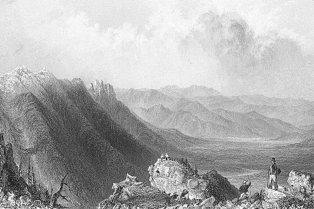 Another traveller thus speaks of the scenery of this spot:—“We rode six miles farther, and came to a farm occupied by a man named Crawford. Here the mountains assumed the form of an immense amphitheatre, elliptical in its figure, from twelve to fifteen miles in length, from two to four in breadth, and crowned with summits of vast height and amazing grandeur. Compared with this scene all human works of this nature, that of Titus particularly, so splendidly described by Gibbon, are diminished into toys and gewgaws. Here more millions could sit than hundreds there; every one of whom could look down with a full view on the valley beneath.