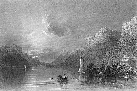 Loch Katrine, at the Trosachs, is a miniature-likeness of Lake George. It is the only lake in Europe that has at all the same style or degree of beauty. The small green islands, with their abrupt shores,—the emerald depths of the water, overshadowed and tinted by the tenderest moss and foliage,—the lofty mountains in the back-ground,—and the tranquil character of the lake, over which the wind is arrested and rendered powerless by the peaks of the hills and the lofty island-summits,—are all points of singular resemblance. Loch Katrine can scarce be called picturesque, except at the Trosachs, however; while Lake George, throughout all the mazes of its three hundred and sixty-five islands (there are said to be just this number), preserves the same wild and racy character of beauty. Varying in size, from a mile in length to the circumference of a tea-table, these little islets present the most multiplied changes of surface and aspect—upon some only moss and flowers, upon others a miniature forest, with its outer trees leaning over to the pellucid bosom of the lake, as if drawn downwards by the reflection of their own luxuriant beauty.