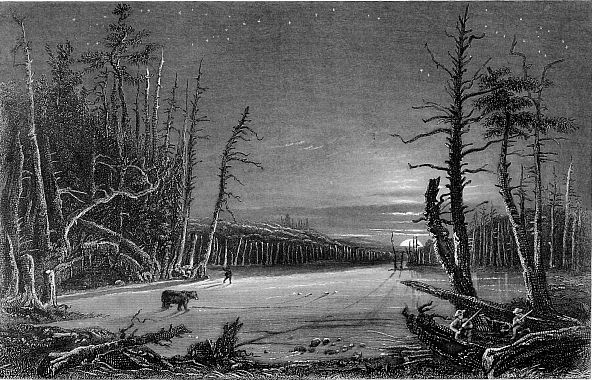 “From the bend of the valley our difficulties became more serious. The drifts often lay across the road like a wall, some feet above the heads of the horses; and we had dug through one or two, and had been once upset, and often near it, before we came to the steepest part of the ascent. The horses had by this time begun to feel the excitement of the rum given them by the driver at the last halt, and bounded on through the snow with continuous leaps, jerking the sleigh after them with a violence that threatened momently to break the traces. The steam from their bodies froze instantly, and covered them with a coat like hoar-frost; and spite of their heat, and the unnatural and violent exertions they were making, it was evident by the pricking of their ears and the sudden crouch of the body when a stronger blast swept over, that the cold struck through even their hot and intoxicated blood.