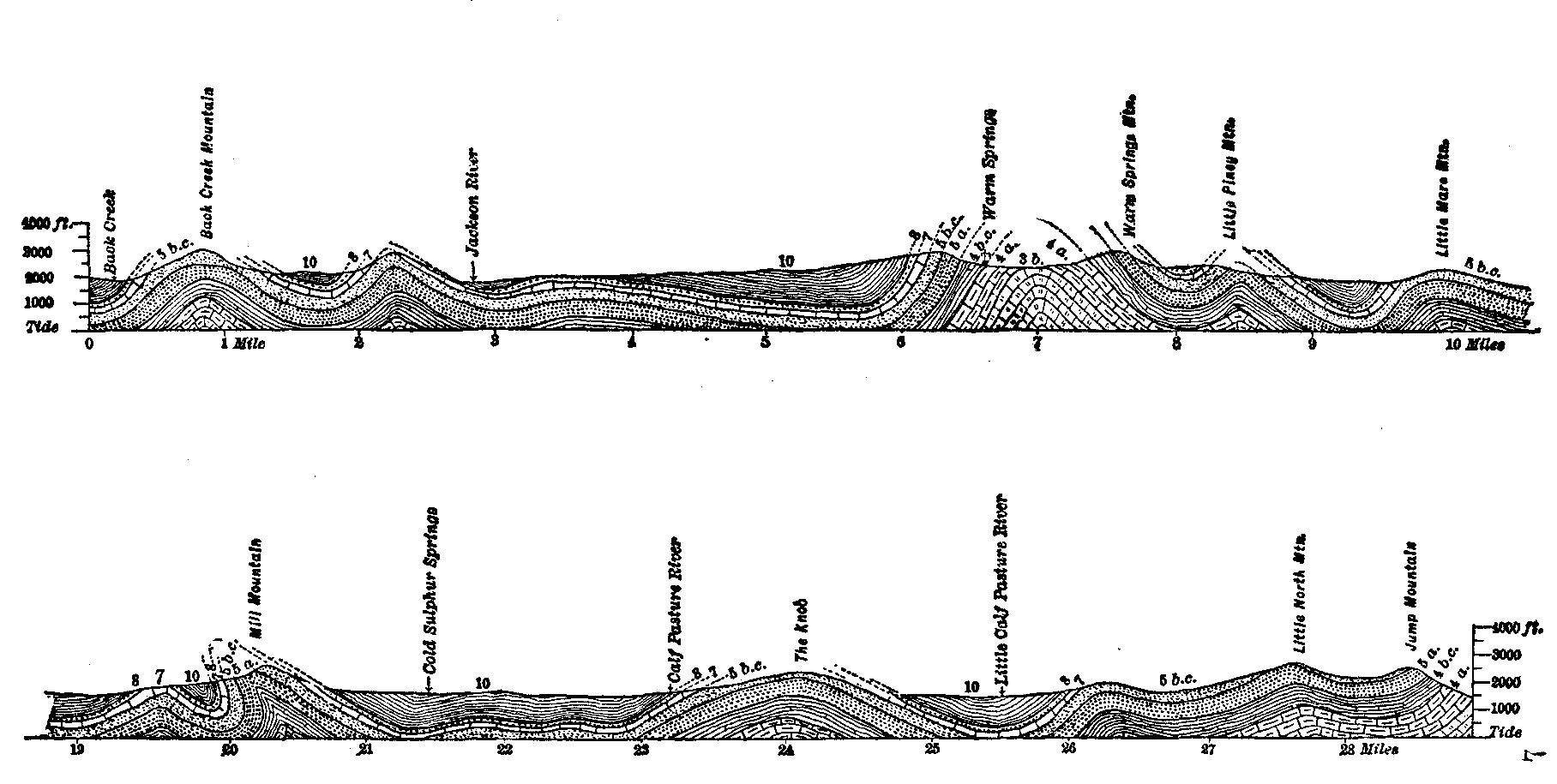 [7] It is reported that one of these natural bridges of Carter County has recently fallen down. This is the natural end of these features. As before remarked, they are but the remnants of much more extensive roofs which the processes of decay have brought to ruin.