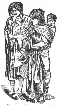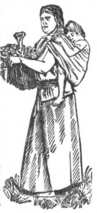 The women wear loose sleeveless waists with a straight piece of cloth pinned around them for skirts, and the habitual rebozo wrapped about the head and holding the equally habitual baby. No difference how cold or warm the day, nor how scant the lower garments, the serape and rebozo are never laid aside, and none seem too poor to own one. Apparently the natives do not believe much in standing, for the moment they stop walking they "hunker" down on the ground.