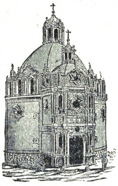 The architecture of this temple pertains to the Doric order. The structure is one hundred and thirty-three Spanish yards in length, and seventy-four in width. It has one hundred and seventy-four windows, and is divided into five naves, the principal one of which measures fifty-three feet in width from column to column. The aisles correspond in number to the thirty-three chapels, formed by twenty pillars, ten on each side; from base to capital the pillars measure fifty-four feet in height, and fourteen in circumference. The roof is composed of fifty-one domes or vaults, resting upon seventy-four arches. The church is pyramidal in form, its height diminishing in regular proportion from the main nave to the chapels. There are three entrance-doors on the southern front, two on the northern, and two on each of the sides.