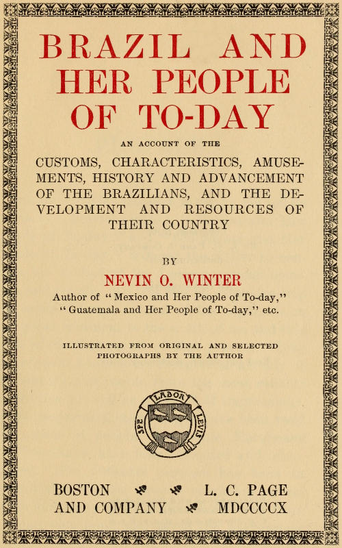 The favourable reception given by the public to the two previous books, “Mexico and Her People of To-day” and “Guatemala and Her People of To-day,” induced the writer to continue his studies of the Latin-American countries and people. To this end an extensive trip was made through several of the republics on that great continent to the south of us, and this work is the first result of that journey. Like the previous books it is presented as a study of the country and people from the most reliable authorities, as well as a record of impressions. In its preparation many books have been read and scores of people, Americans, Europeans and Brazilians, have been consulted and interviewed. The author’s purpose has been to present this treatise upon a neighbouring republic and study of our fellow Americans from a broad viewpoint, and avoid the narrowness[vi] of some writings in which everything different or unfamiliar is deemed a fit subject for caustic criticism. With this brief explanation of the purpose of this book, and method of its preparation, “Brazil and Her People of To-day” is given to the public.