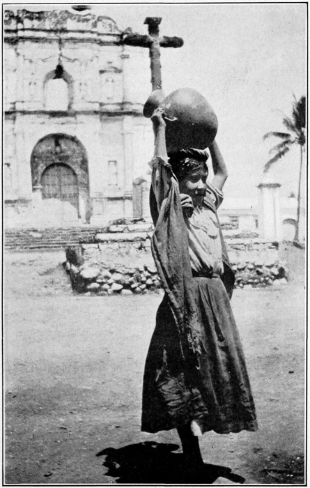 The Pacific side of Central America, from 4Guatemala to Nicaragua, is a highly volcanic region, and Guatemala has her full share. The many companion peaks and notched ranges as they are seen from the sea look like great fangs. In no country in the world can one find a greater number of perfect cones than in Guatemala where there are scores of these peaks ranging from Tajumulco (13,814 feet), and Tacana (13,334 feet), down to small cones only a few hundred feet above the sea level, yet maintaining the characteristic outline. Many of the peaks have never been ascended so that little is known about their formation. All of these volcanoes are now extinct, or at least quiescent, except Santa Maria (10,535 ft.), from which smoke and steam constantly issue out of a fissure, or crater, on the side several hundred feet from the top of the cone or crater proper. This volcano had been quiet so long that it was looked upon as extinct until early in April, 1902, rumblings were heard, and suddenly it belched forth mud and sand, throwing the latter fifty miles or more. By this eruption Quezaltenango, hitherto an enterprising town and second city in the republic, was almost ruined, and several thousand of its inhabitants destroyed. A number of villages near the base of the mountain 5were almost completely demolished and a part of Ocos, the most northerly Pacific port, sank into the sea during one of the earthquakes which accompanied the eruption.