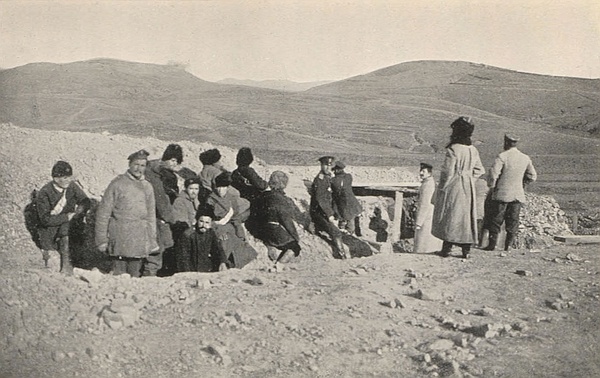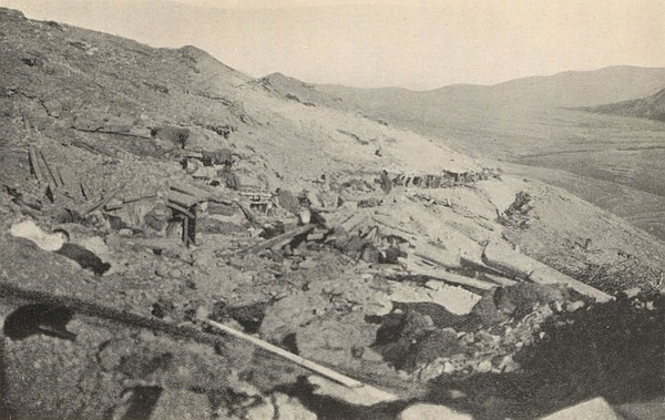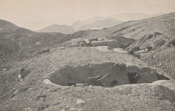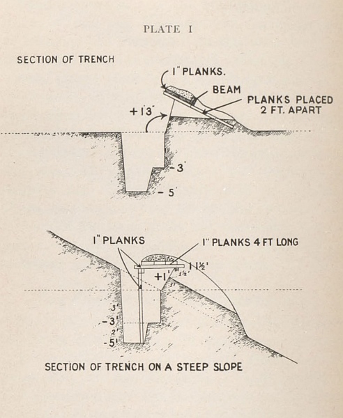[97] The usual rate of advance of a sap is from 2 to 4 feet per hour, depending on the nature of the soil and the amount of excavation necessary. The latter must, of course, depend on due cover for the party being provided. The Official History states that breastworks, or, more correctly speaking, “parapets” had to be built up, 5 feet high and 4 feet thick, with sand-bags, as ordinary digging was impossible in the rocky formation of 203 Metre Hill. This accounts for the slow rate of progress. Though it is not clear from the narrative, the type of sap was probably that known as “double.”