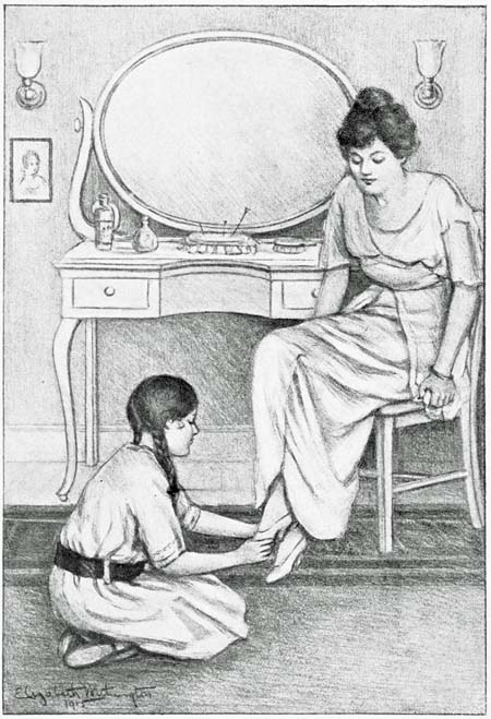 SHE did not know that she was a Cinderella, as she knelt on the floor putting on Miss Ada Marsh’s satin slippers. She had never even thought of such a possibility, and if any one had mentioned it to her she would have opened her big brown eyes very wide, and felt inclined to regard the suggestion as a rather foolish joke. In her own humble opinion she was not a person of the very least importance, being only little Gretel Schiller, whom nobody seemed to care very much about, and who lived with Mrs. Marsh, because there didn’t seem to be any other place for her to live. It seemed to her quite natural that she should make herself useful in the family, considering—as Mrs. Marsh frequently reminded her—that her half-brother, who lived in China, paid very inadequately for her support.[12] But this evening her heart was beating fast and she was regarding Miss Ada Marsh with more interest than usual for was not that young lady actually going to fairy-land?