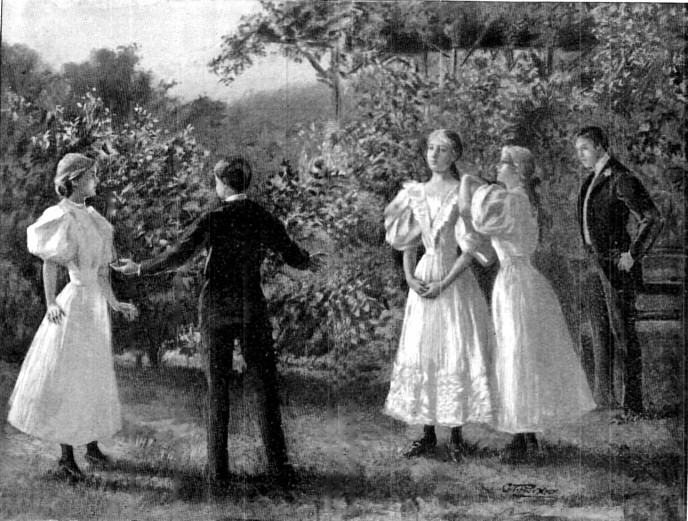 Marian was standing at the farther end of the parlor facing the doorway, with two of the Selwyn cousins beside her, as the fresh arrivals appeared. She was laughing joyously as they entered; but at her very first glimpse of the approaching group, the laugh ceased, and a look of sudden resolve flashed into her face,—a look that the Selwyn cousins, who had been told the whole story of the fraudulent invitation, understood at once to mean, "Here is my opportunity and I'll make the most of it!" But to the others—to the four who were approaching—this sudden change in their hostess's face was thus variously interpreted: "She has seen Angela," thought the Ryder girls, triumphantly. "She has seen the Ryder girls, and she is going to punish them," thought Mary, nervously. "She is looking at my dreadful old gown," thought Angela, miserably.