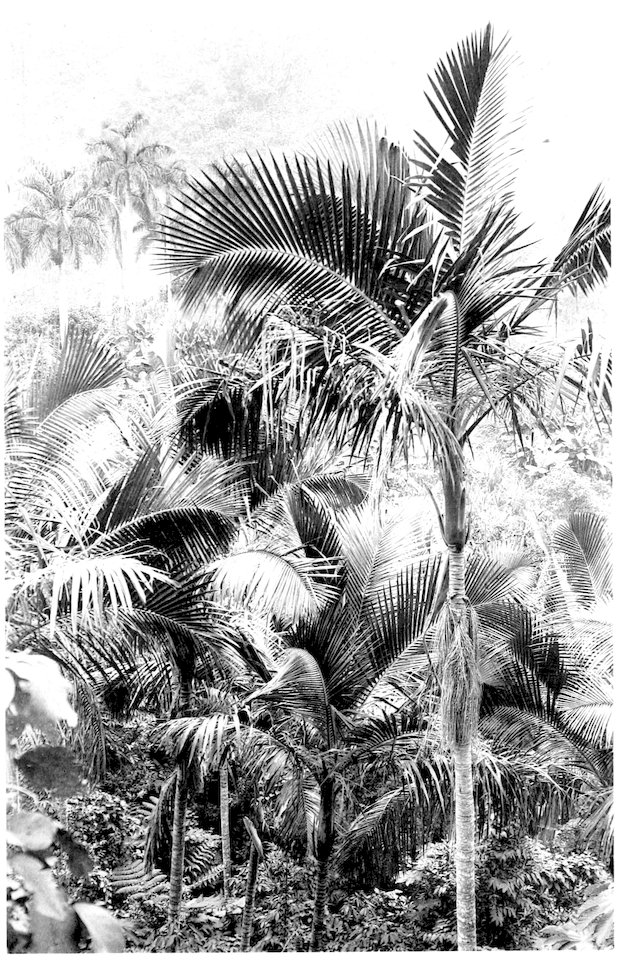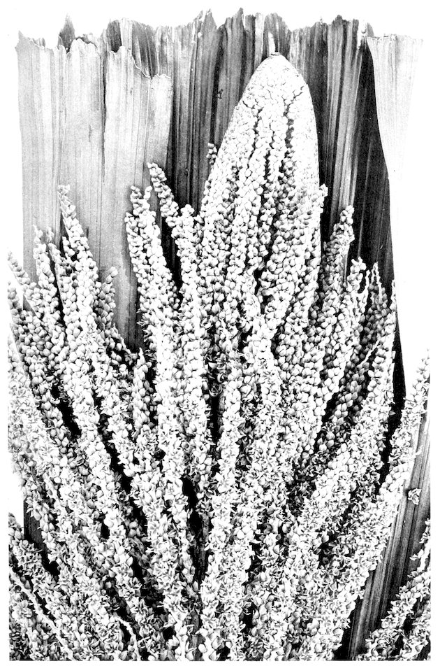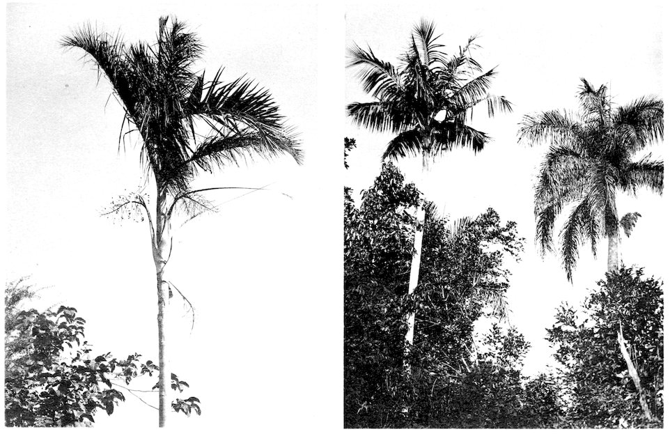 Although totally different on close inspection this genus has in Puerto Rico a superficial resemblance to the royal palm, which often deceives travelers. The similarity lies mostly in the two facts that both the royal and corozo palms are more robust and stiffly erect than the cocoanut, and that the leaf-divisions instead of lying 566horizontal and in one plane are tilted at different angles to the midrib, thus giving the foliage seen in the mass a somewhat unkempt appearance in comparison with the cocoanut.