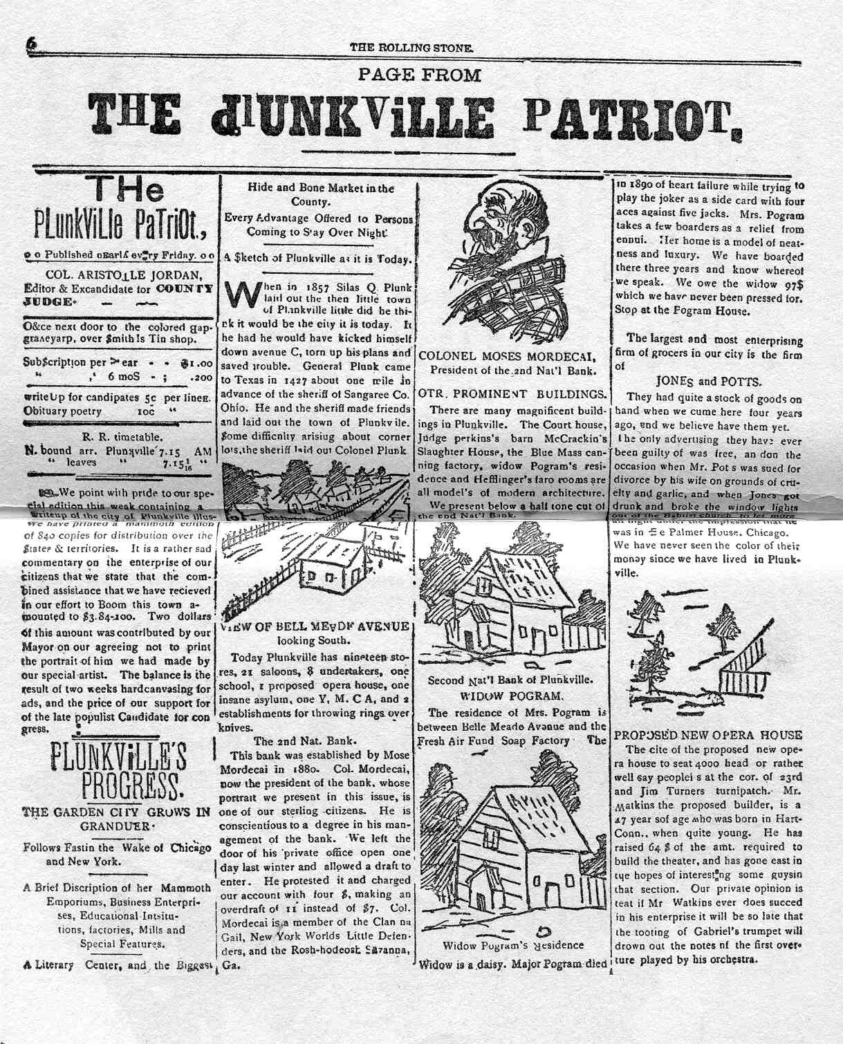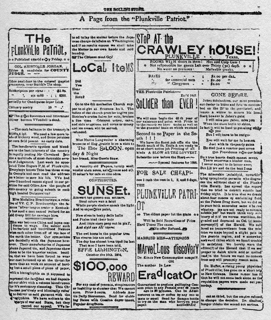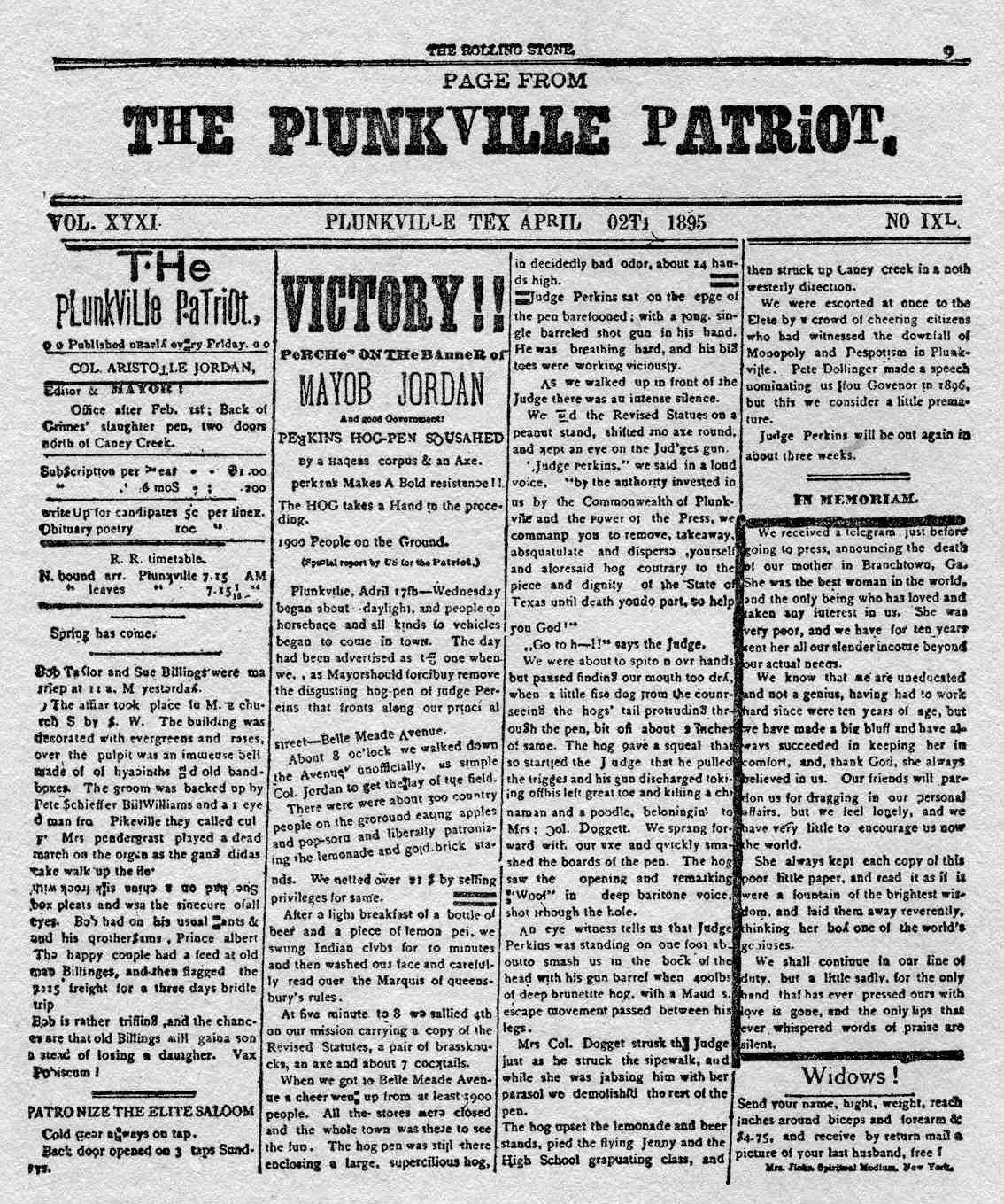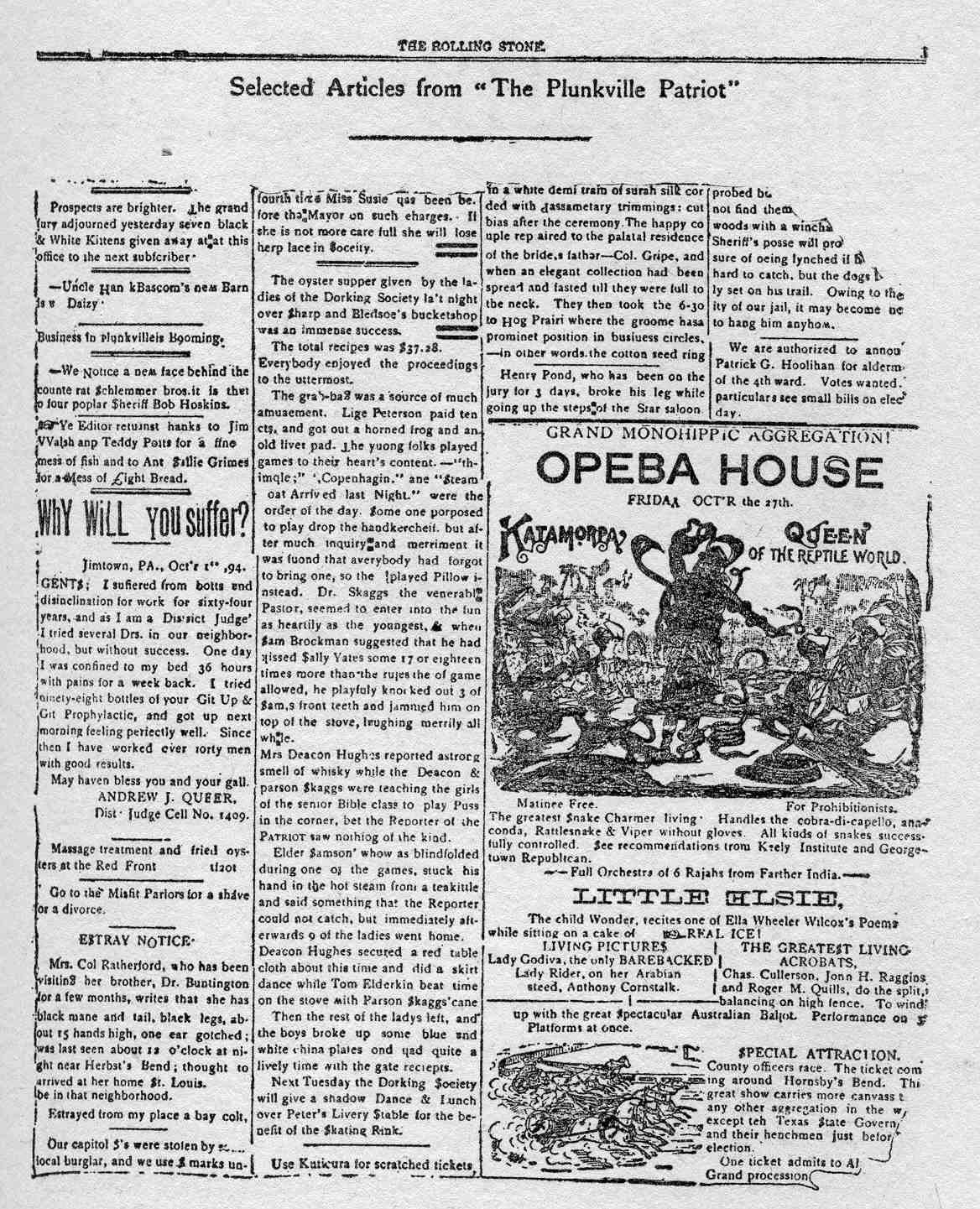 Perhaps the most characteristic feature of the paper was “The Plunkville Patriot,” a page each week—or at least with the regularity of the somewhat uncertain paper itself—purporting to be reprinted from a contemporary journal. The editor of the Plunkville Patriot was Colonel Aristotle Jordan, unrelenting enemy of his enemies. When the Colonel’s application for the postmastership in Plunkville is ignored, his columns carry a bitter attack on the administration at Washington. With the public weal at heart, the Patriot announces that “there is a dangerous hole in the front steps of the Elite saloon.” Here, too, appears the delightful literary item that Mark Twain and Charles Egbert Craddock are spending the summer together in their Adirondacks camp. “Free,” runs its advertising column, “a clergyman who cured himself of fits will send one book containing 100 popular songs, one repeating rifle, two decks easywinner cards and 1 liver pad free of charge for $8. Address Sucker & Chump, Augusta, Me.” The office moves nearly every week, probably in accordance with the time-honored principle involving the comparative ease of moving and paying rent. When the Colonel publishes his own candidacy for mayor, he further declares that the Patriot will accept no announcements for municipal offices until after “our” (the editor’s) canvass. Adams & Co., grocers, order their $2.25 ad. discontinued and find later in the Patriot this estimate of their product: “No less than three children have been poisoned by eating their canned vegetables, and J. O. Adams, the senior member of the firm, was run out of Kansas City for adulterating codfish balls. It pays to advertise.” Here is the editorial in which the editor first announces his campaign: “Our worthy mayor, Colonel Henry Stutty, died this morning after an illness of about five minutes, brought on by carrying a bouquet to Mrs. Eli Watts just as Eli got in from a fishing trip. Ten minutes later we had dodgers out announcing our candidacy for the office. We have lived in Plunkville going on five years and have never been elected anything yet. We understand the mayor business thoroughly and if elected some people will wish wolves had stolen them from their cradles…”