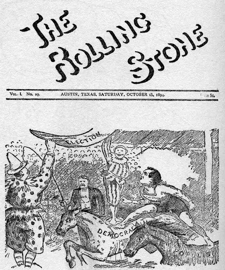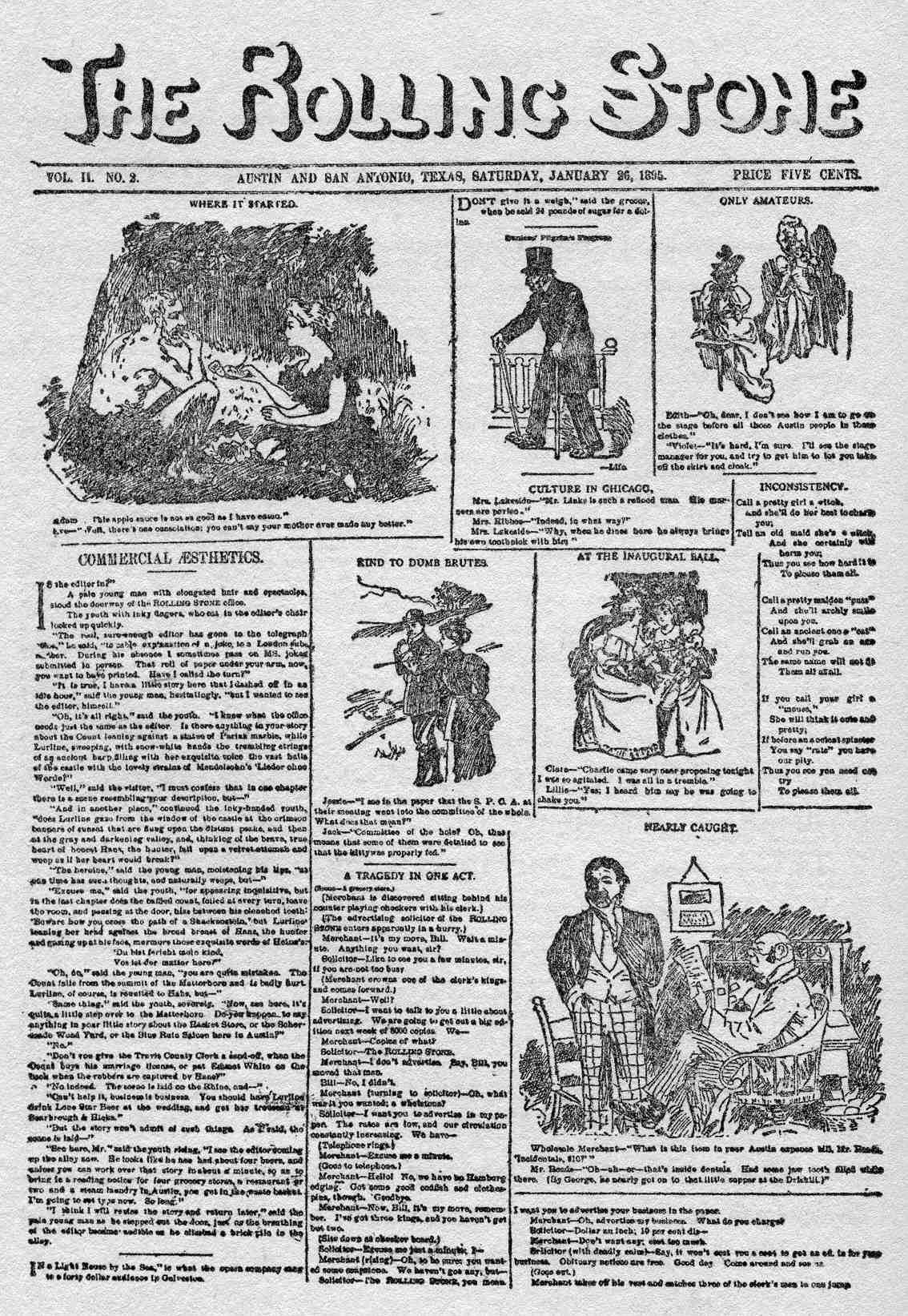 THE ROLLING STONE is a weekly paper published in Austin, Texas every Saturday and will endeavor to fill a long-felt want that does not appear, by the way, to be altogether in- satiable at present. THE IDEA IS to fill its pages with matter that will make a heart-rending appeal to every lover of good literature, and every person who has a taste for reading print; and a dollar and a half for a year’s subscription. OUR SPECIAL PREMIUM For the next thirty days and from that time on indefinitely, whoever will bring two dol- lars in cash to The Rolling Stone office will be entered on the list of sub- scribers for one year and will have returned to him on the spot FIFTY CENTS IN CASH |