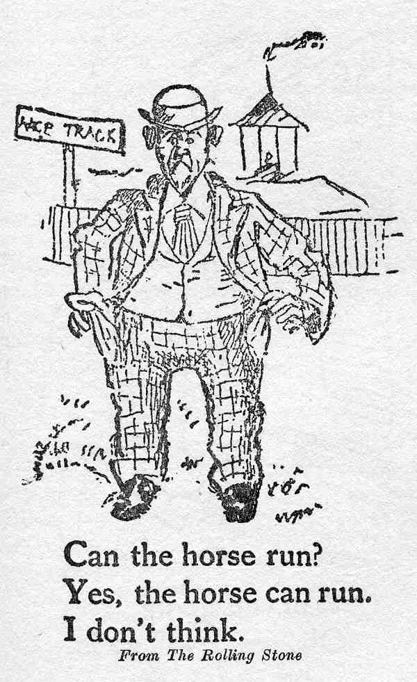 This the twelfth and final volume of O. Henry’s work gets its title from an early newspaper venture of which he was the head and front. On April 28, 1894, there appeared in Austin, Texas, volume 1, number 3, of The Rolling Stone, with a circulation greatly in excess of that of the only two numbers that had gone before. Apparently the business office was encouraged. The first two issues of one thousand copies each had been bought up. Of the third an edition of six thousand was published and distributed free, so that the business men of Austin, Texas, might know what a good medium was at hand for their advertising. The editor and proprietor and illustrator of The Rolling Stone was Will Porter, incidentally Paying and Receiving Teller in Major Brackenridge’s bank.