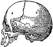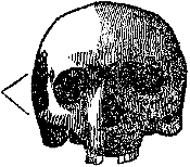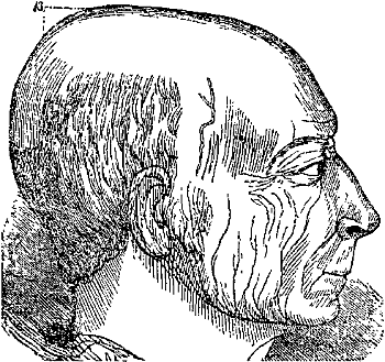 Take, next, this same line, starting from the outer angle of the eye, to the top of the ears, and extend it straight backward an inch and a half to an inch and three quarters, and you are on Combativeness. This organ starts about midway to the back part of the ears, and runs upward and backward toward the crown of the head. To ascertain its relative size, steady the head with one hand, say the left, and place the balls of your right fingers upon the point just specified letting your elbow be somewhat below the subject’s head, which will bring your fingers directly ACROSS the organ. Its size may be ascertained partly from the general fullness of the head, and partly from its sharpness, according as the organ is more or less active; yet observers sometimes mistake this organ for the mastoid process directly behind the lower part of the ears. Remember our rule, namely: a line drawn from the outer angle of the eye to the top of the ear, and continued an inch and a half or three quarters straight back. Follow that rule, and you cannot mistake the position of this organ; and will soon, by comparing different heads, be able to arrive at those appearances when large or small.